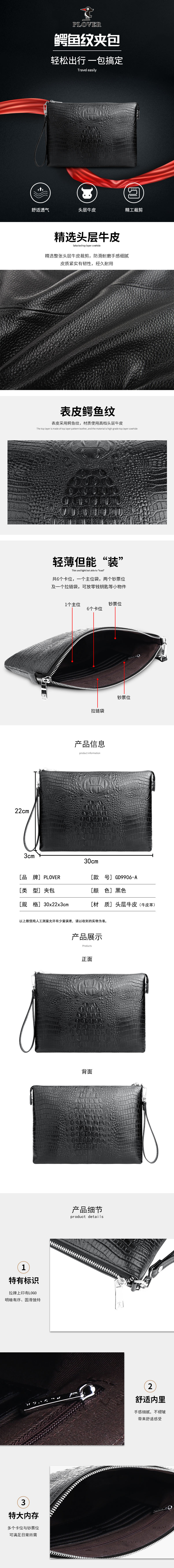 主面料采用头层牛皮压印鳄鱼纹路,大气的鳄鱼纹路凸显本产品的气质,可拆卸手腕带适合不同环境使用,内部双隔层,拉链暗格袋,加大内部空间,顺滑五金拉链,无处不体现本产品的品牌气质;