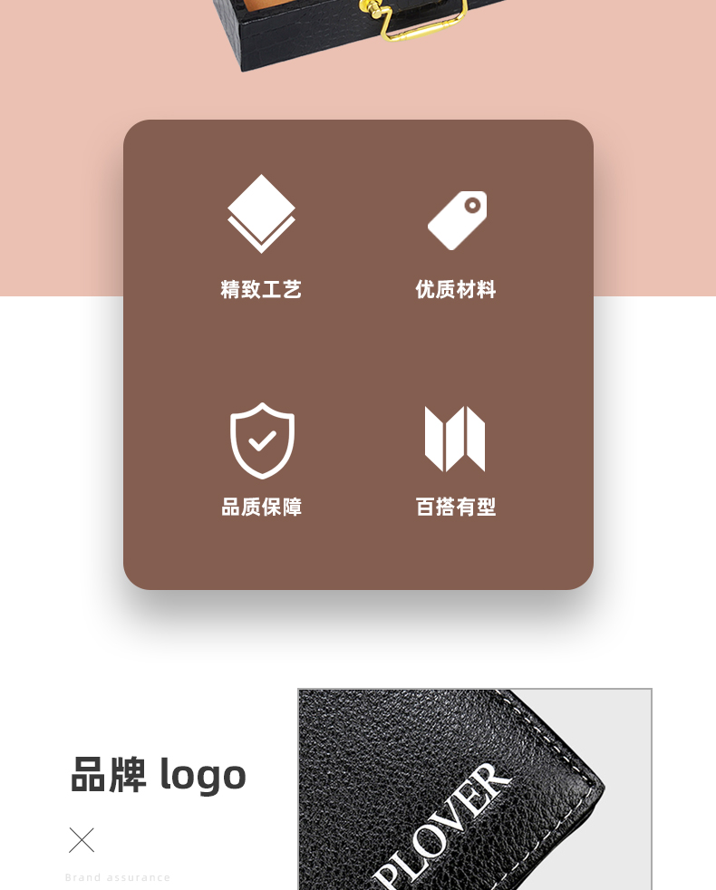 长夹精选头层牛皮制作,皮纹清晰而细腻,车缝线和LOGO,采用撞色搭配,醒目时尚,展现英伦风采带身使用二层牛皮,十字纹皮带侧边车线+油边工艺美观且耐用,外包装使用高档木质礼盒