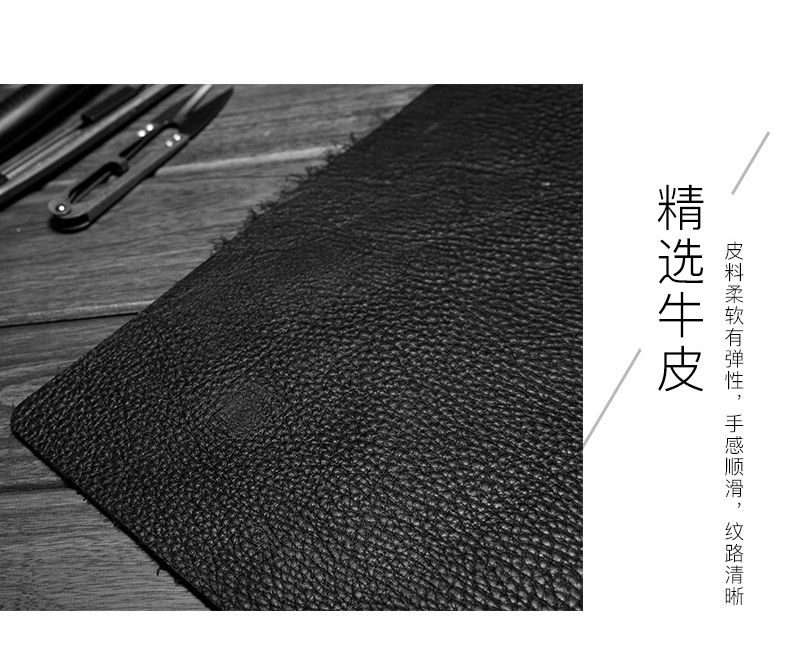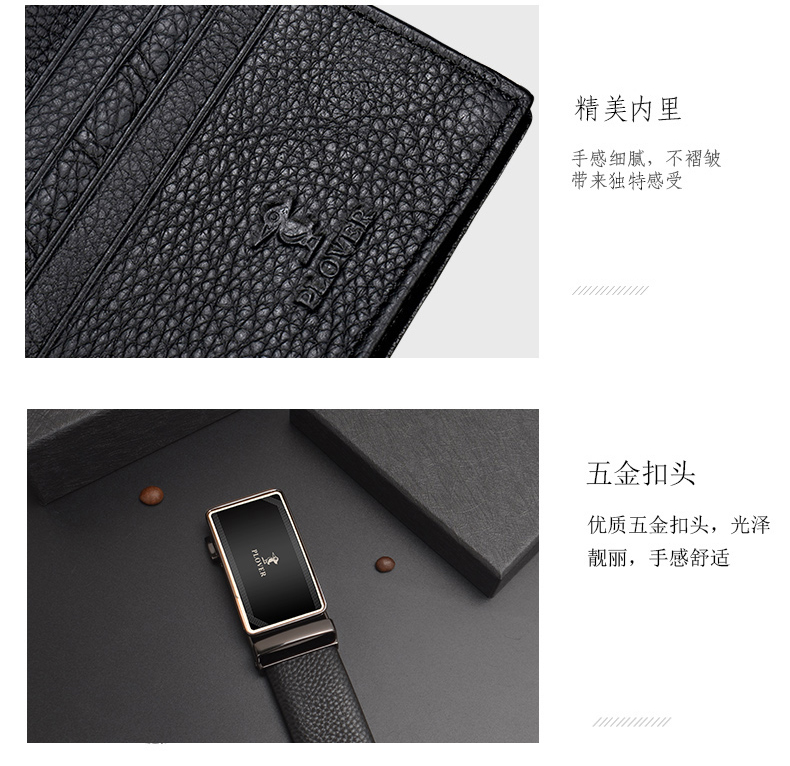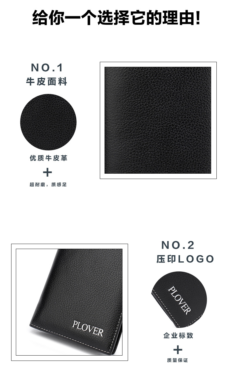 钱夹精选头层牛皮,舒适耐磨,大面丝印品牌logo,多功能内袋设计,带身选用头层牛皮,扣头采用锌合金真空电镀,带身尾部采用热压logo工艺;