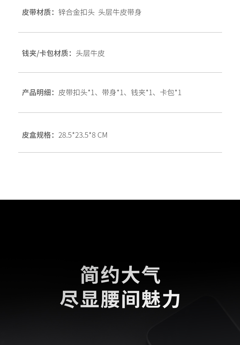 礼盒套装给人的第一感觉大概就是:高档大气上档次是我的标配!长夹精选头层牛皮,纹理精致细腻,多功能卡位设计!卡包精选头层牛皮,手感细腻做工精细!扣头采用锌合金真空电镀工艺,持久耐用!带身同样也是精选头层牛皮打造,皮之上的优越感,腰间的贵族气质!高档的礼物盒!不管自用还是送礼都是最佳首选!