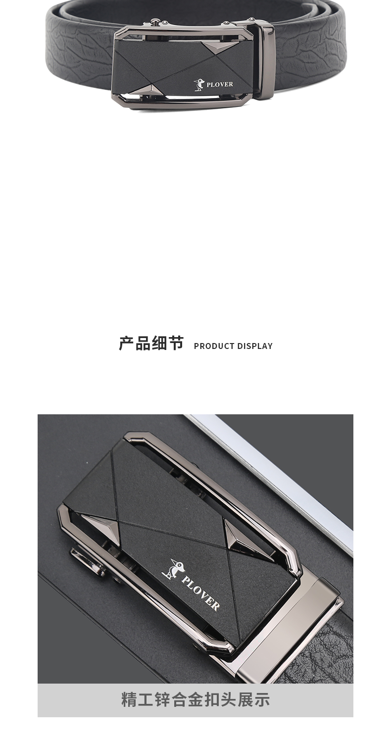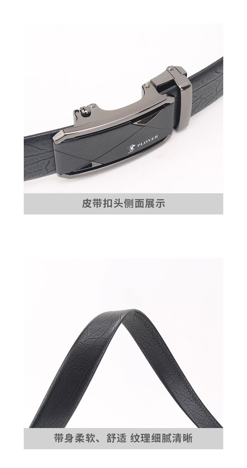 带身手感柔软耐用,纹理精致细腻。扣头采用锌合金真空电镀工艺,两边镂空设计新颖!隐藏式车线工艺,高温耐变形夹层,产品紧实,环保,更耐用!