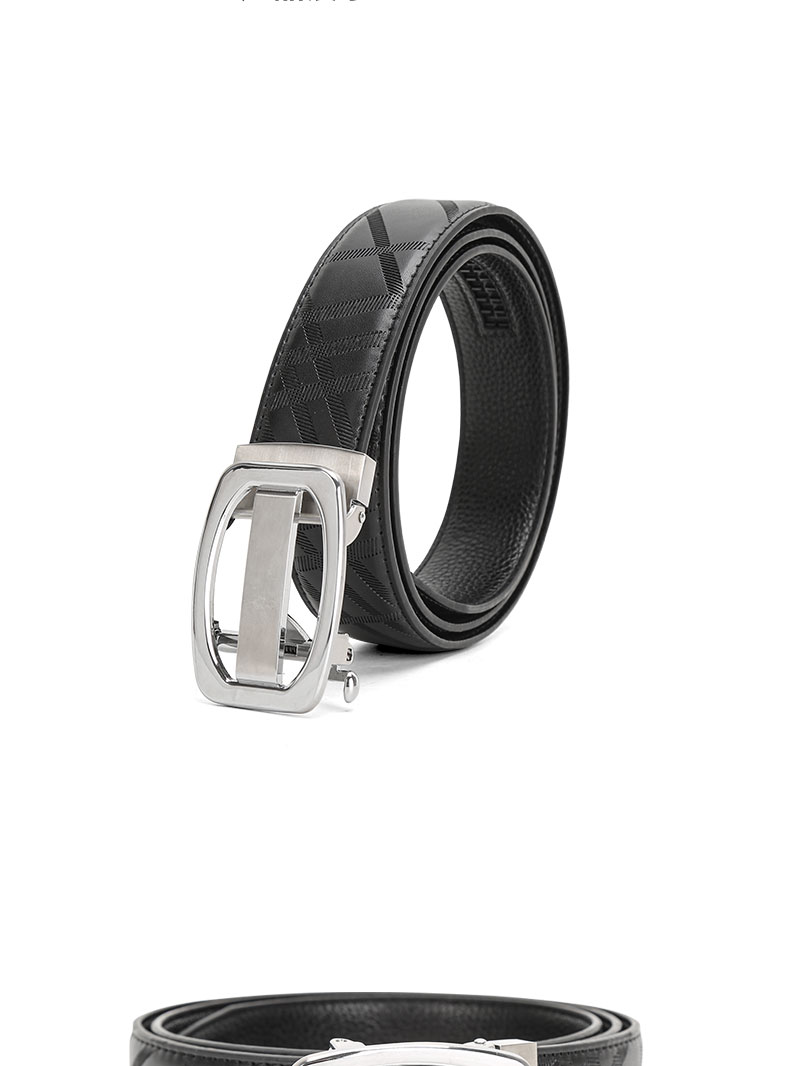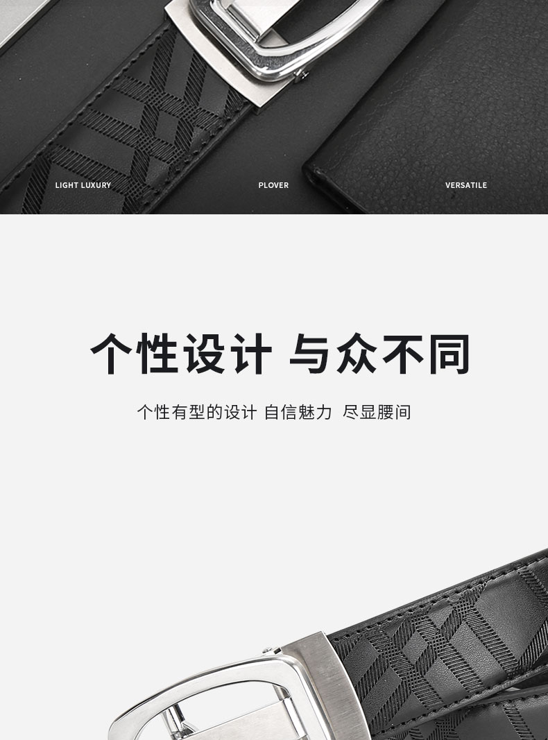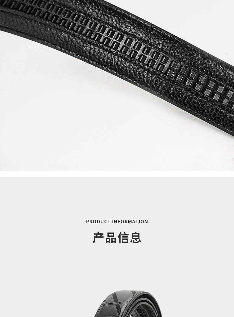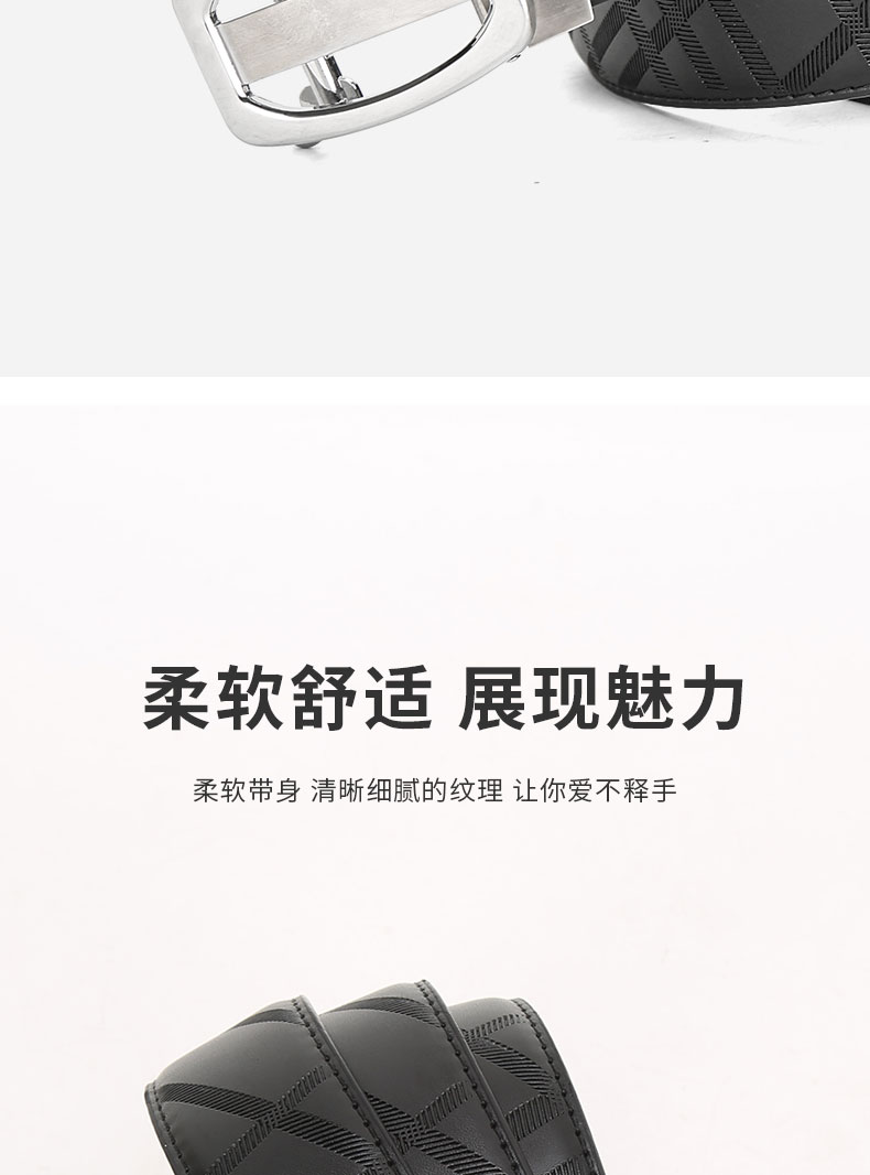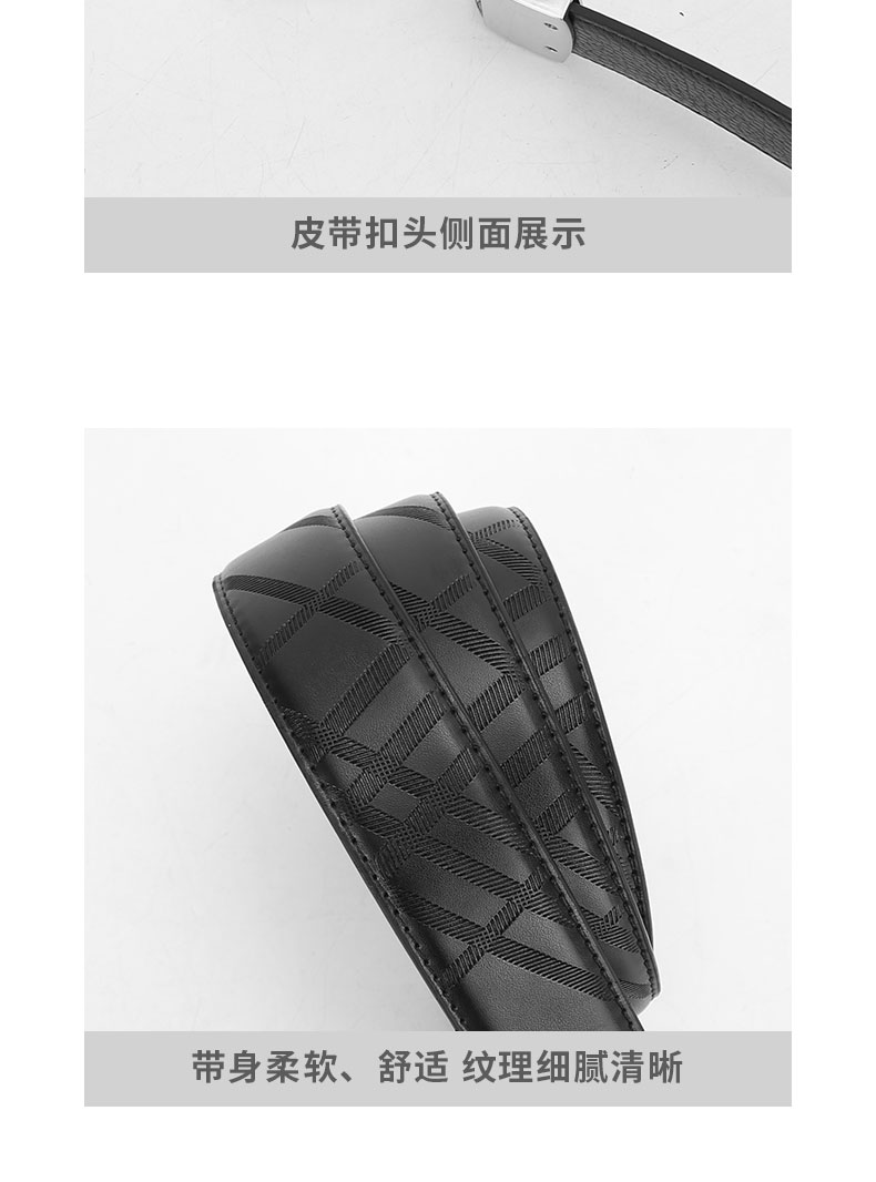 皮带采用耐磨PU革、不易断裂、压花工艺,条纹清晰,内部采用高强度防变形夹心,休闲时尚,搭配中间镂空椭圆扣头,高端大方