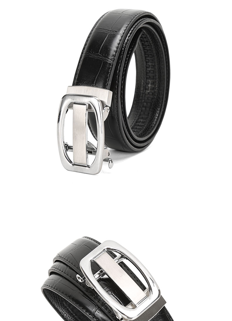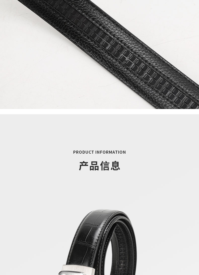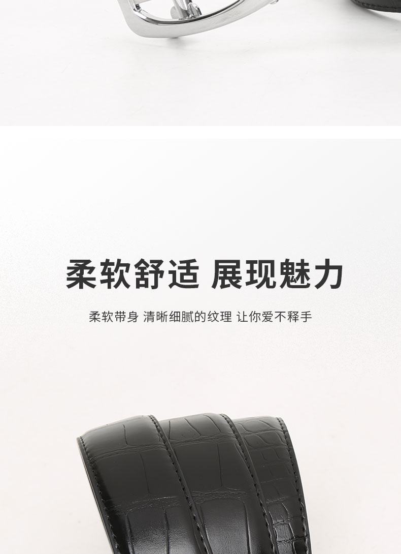 皮带采用耐磨PU革、不易断裂、压花工艺,防鳄鱼纹路,内部采用高强度防变形夹心,休闲时尚,搭配中间镂空椭圆扣头,高端大方