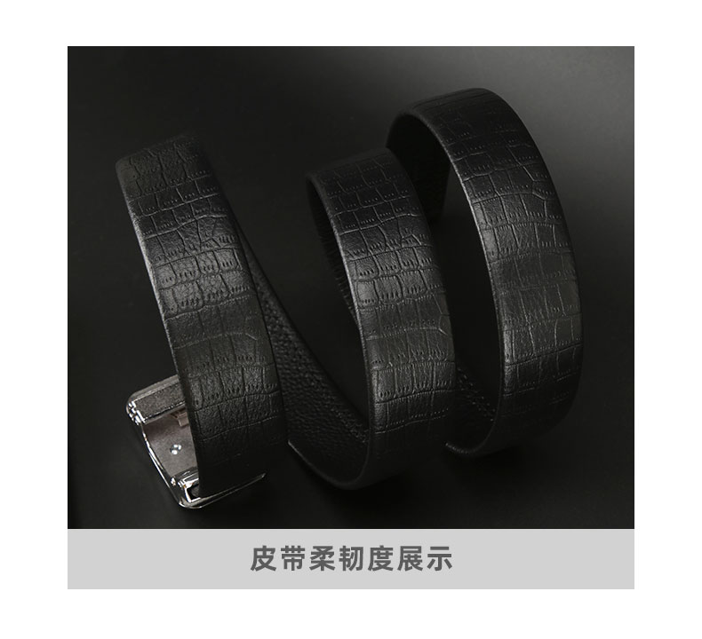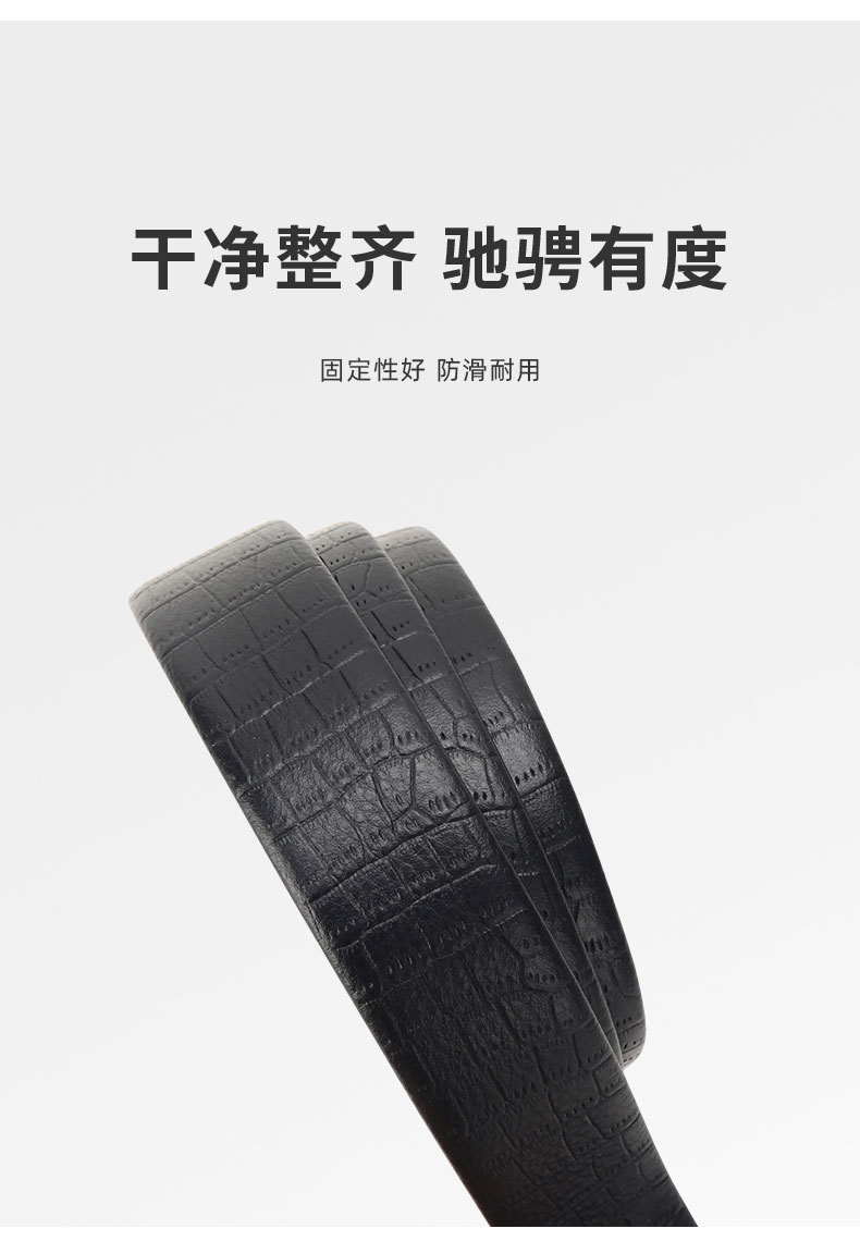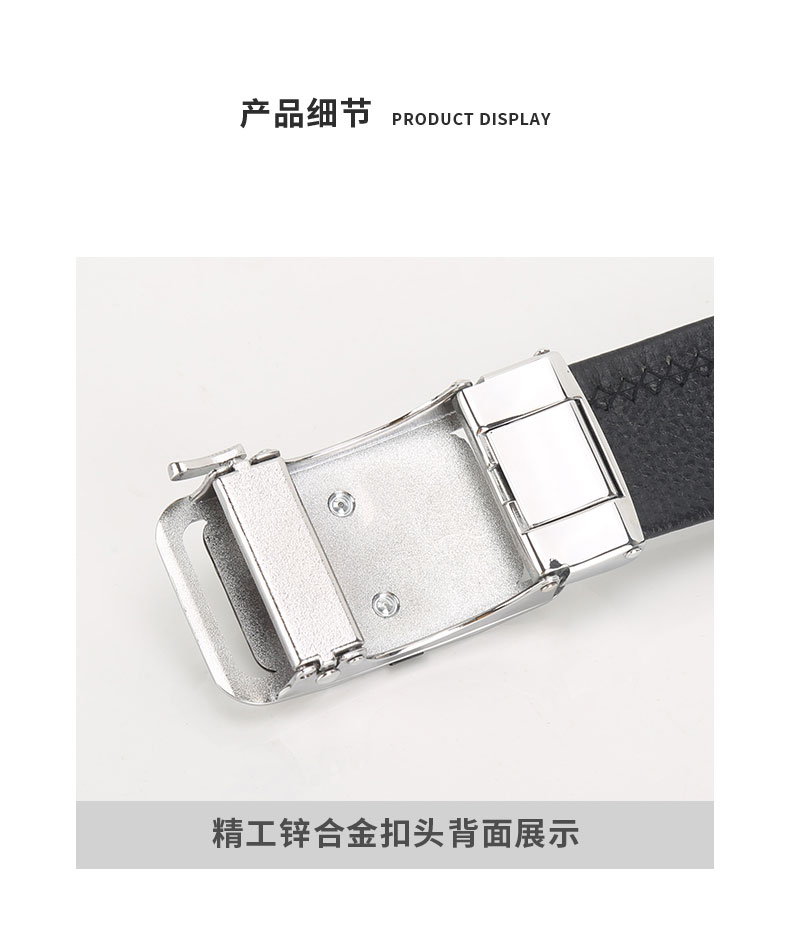 皮带采用头层皮压花,猪肠带做法,手感细腻,质感舒适,扣头采用锌合金电镀工艺,磨砂贴片,扣头中间品牌LOGO点缀,让整个设计更显大方简洁!