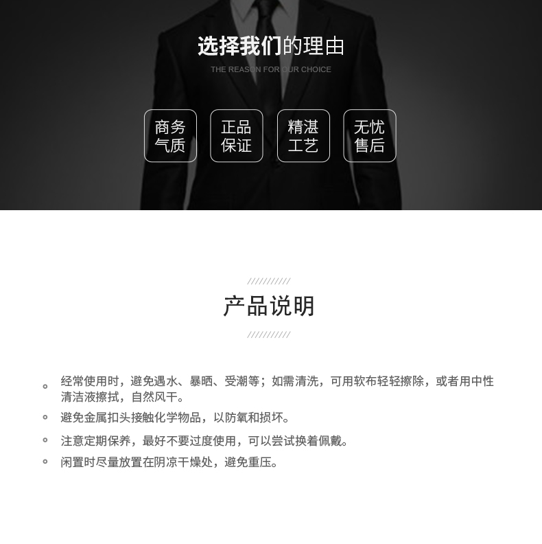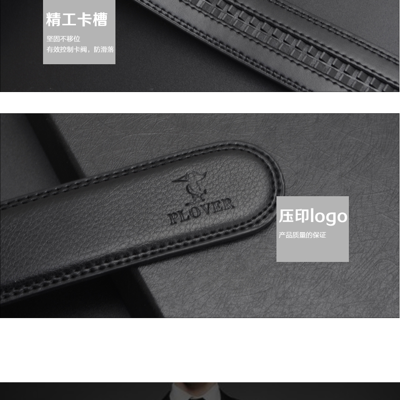 锌合金材质扣头+真空电镀,亚克力贴片工艺尽显质感,内置贴片LOGO设计,带身采用车线+油边工艺美观且耐用,内部采用高强度防变形夹心