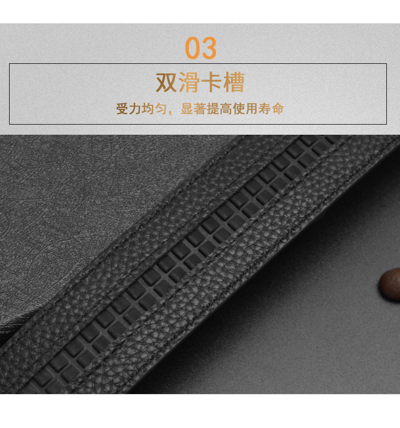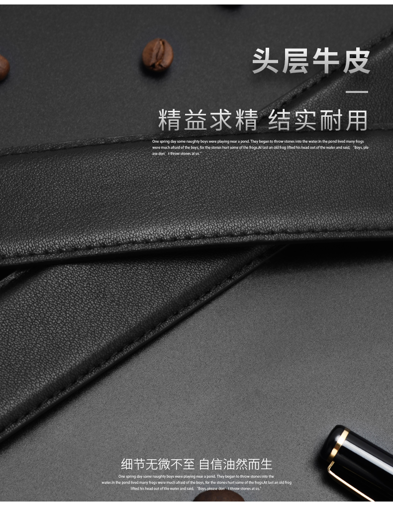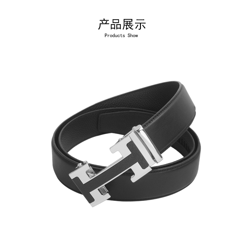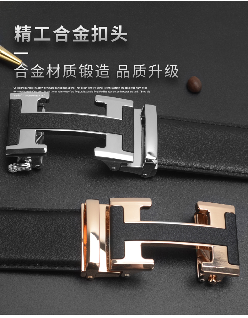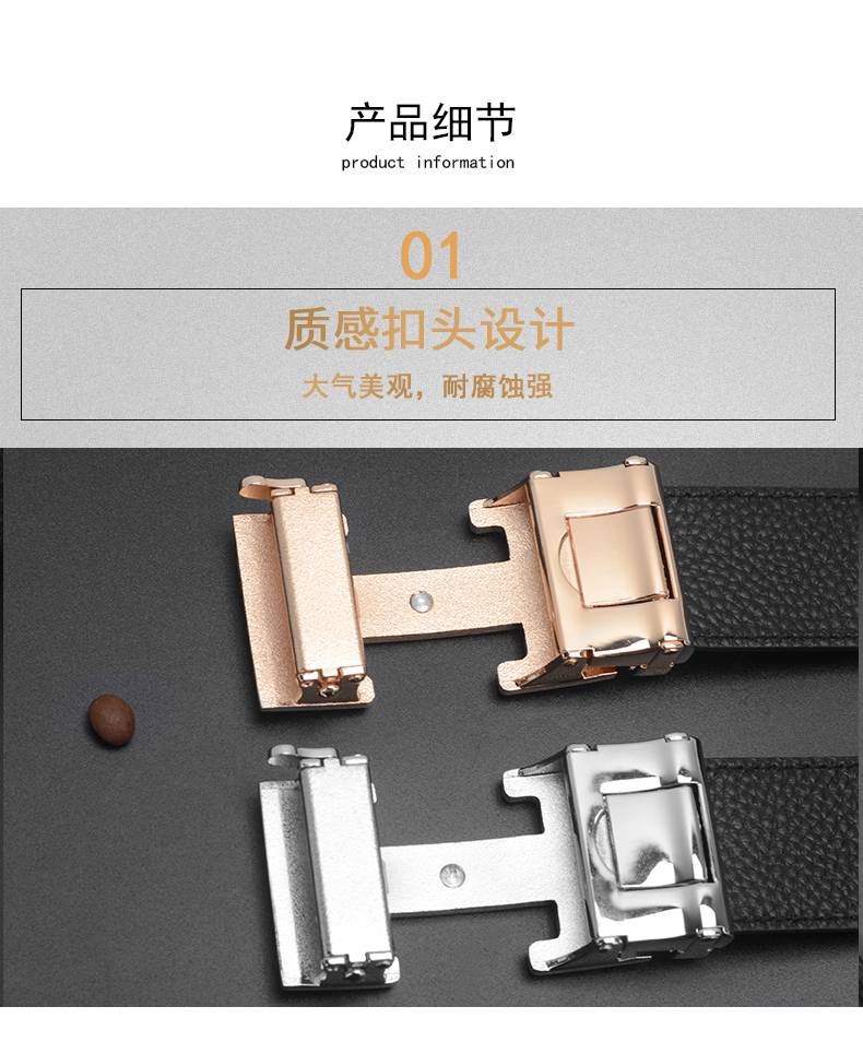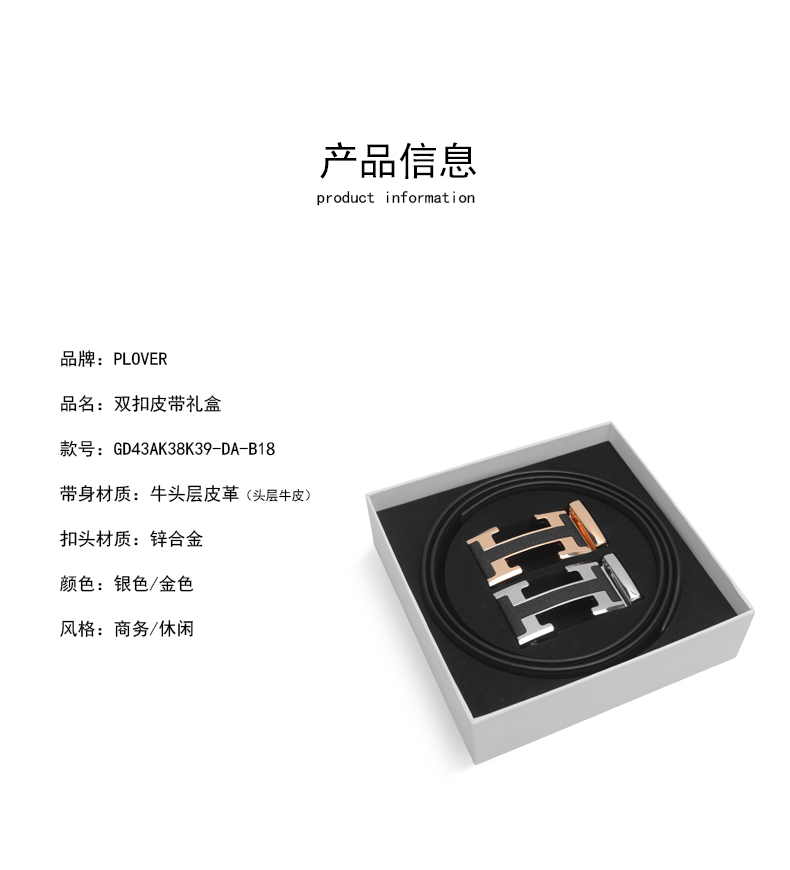 本产品采用金银双色扣头可灵活搭配的设计,款式时尚,高端大气.带身面皮是耐刮耐磨擦的柔软平纹牛皮,底采用纹路清晰分明的荔枝纹头皮.高端防氧化的合金双扣头与牛皮带身配套搭配,再加精美礼盒包装,美观协调.高端显档次.