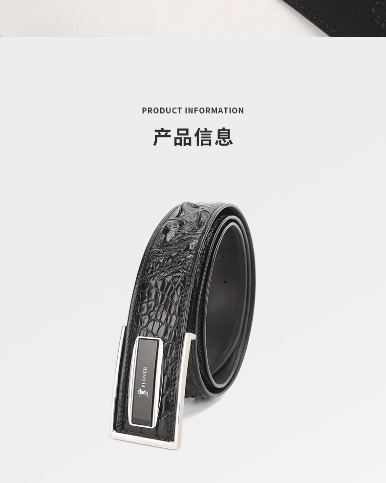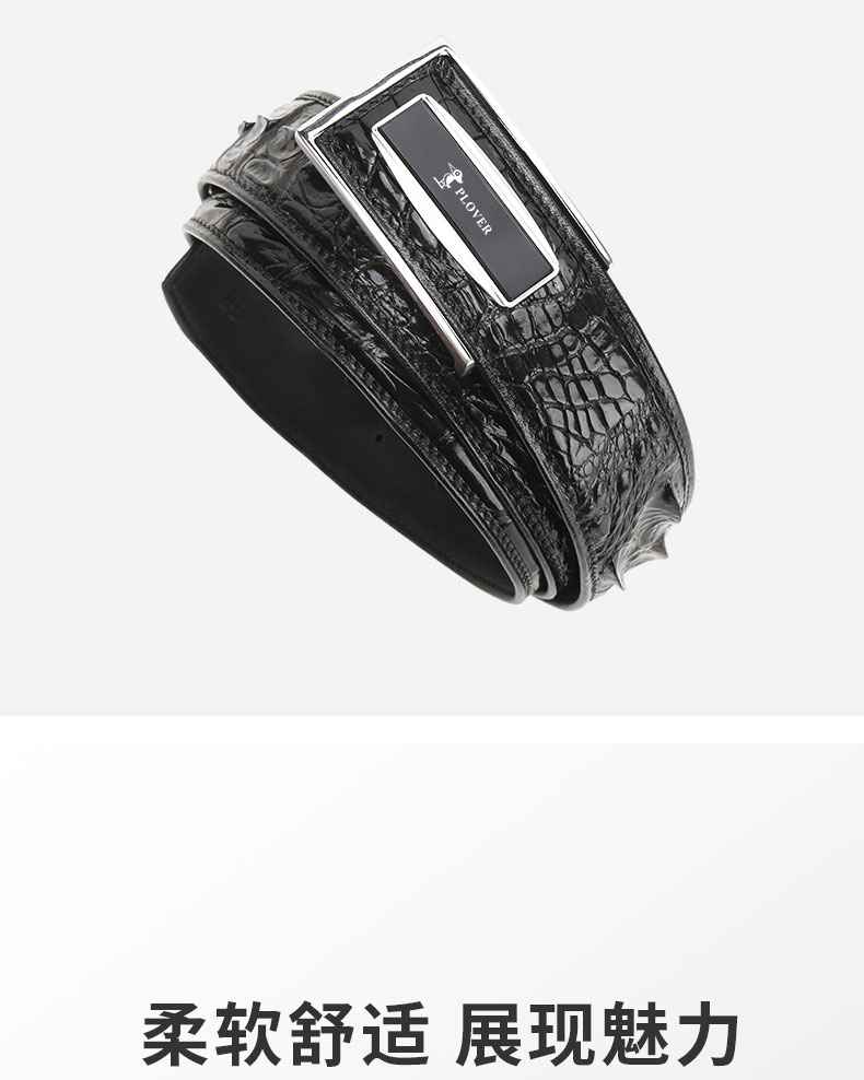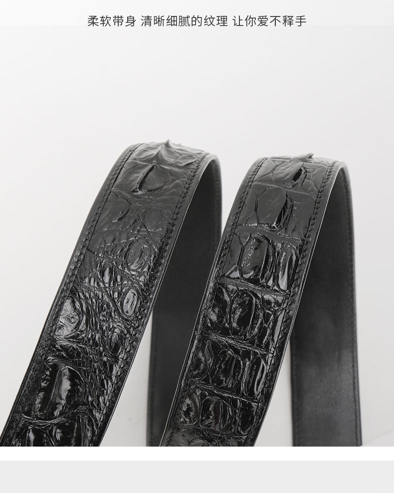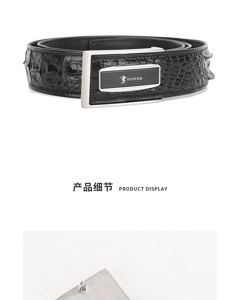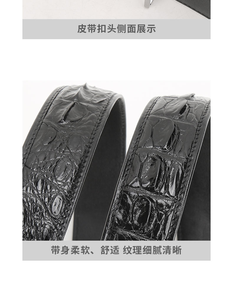 本产品带身面皮采用真鳄鱼背骨皮,此皮面磅礴大气,纹理自然饱满,抗拉伸不易变形;底是皮质柔软,耐磨性强的头层平纹皮,此带身手感细腻,质感舒适,再搭配防刮耐磨、耐腐蚀、耐高温、抗氧化、不易刮花、坚固耐用的仿钢扣头,及传统和现货相结合的做工、鳄鱼纹高端皮盒,使本产品突显高大上。