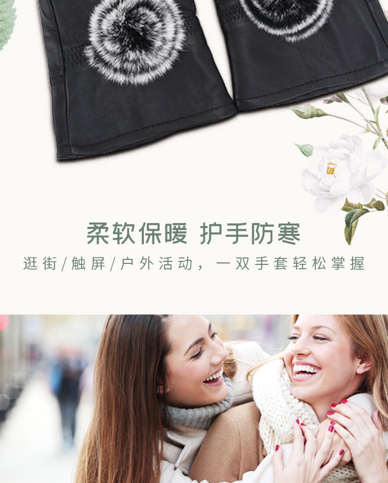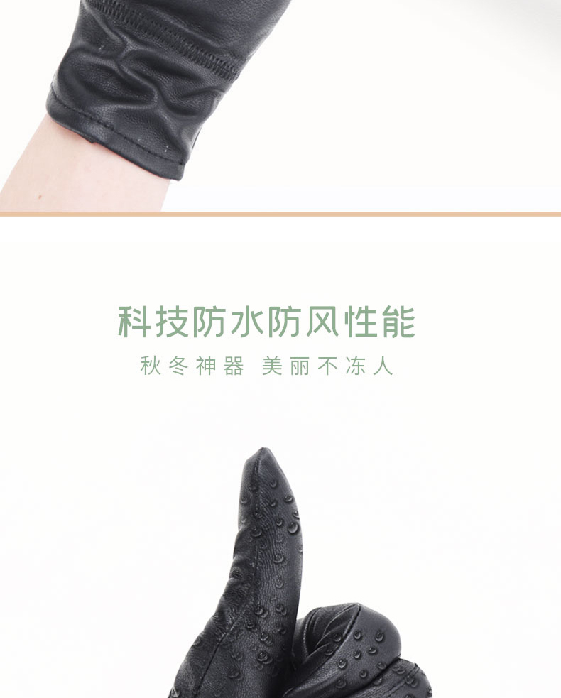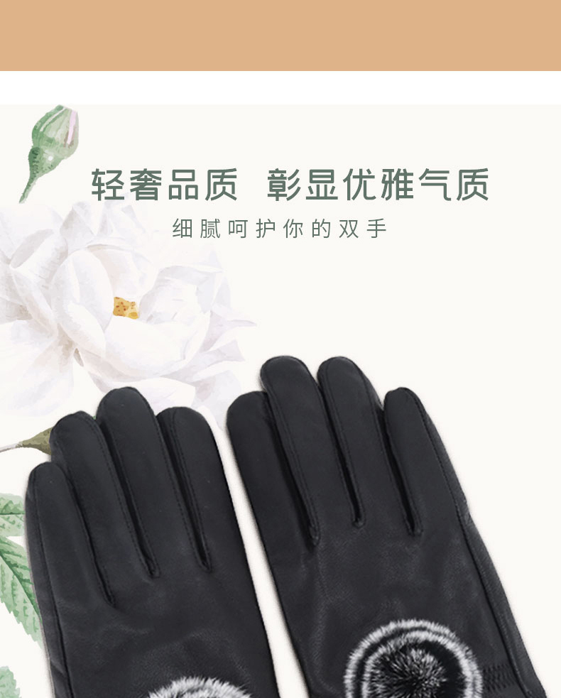 手套的面料选用优质柔软的羊皮,触感柔软顺滑。加绒密度更强更细密,有效抵挡寒风,保暖更胜一筹。款式新颖,做工精美,贴合手部的剪裁,这样会显得手指纤长,不臃肿。没过多的装饰,简约大方,自带高贵感!---不可触屏