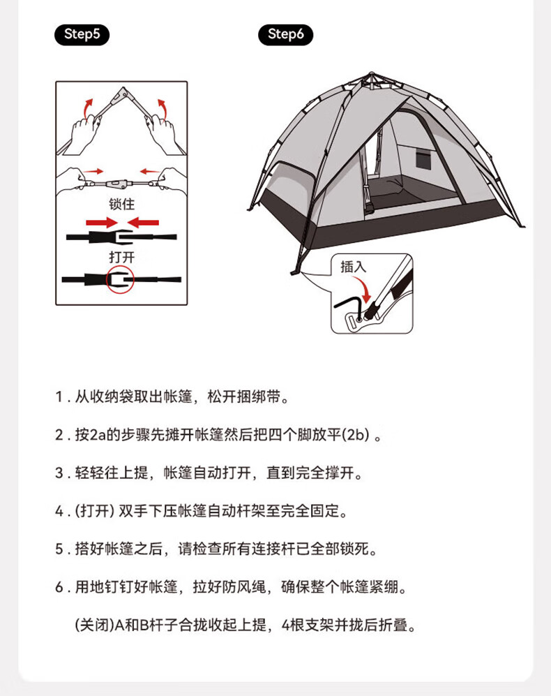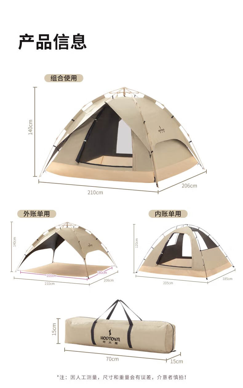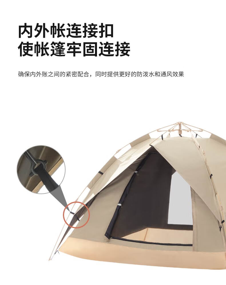 外帐面料采用210D黑胶pu布,有出色的防晒能力,防泼水、遮光、遮温、可自动速开搭建,方便使用。