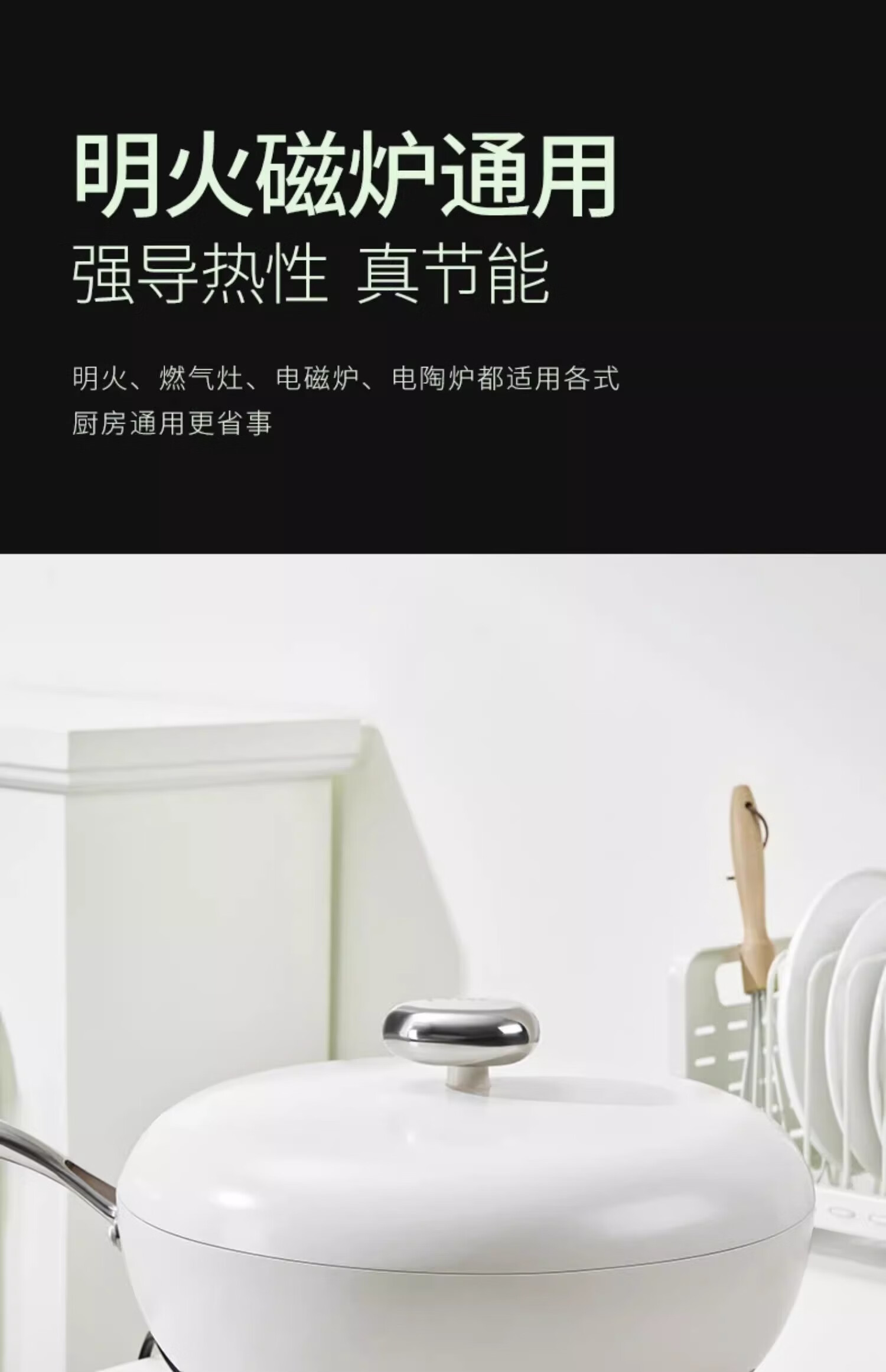 密封锅盖,精工所热,少油少烟,加深锅底不外溢。