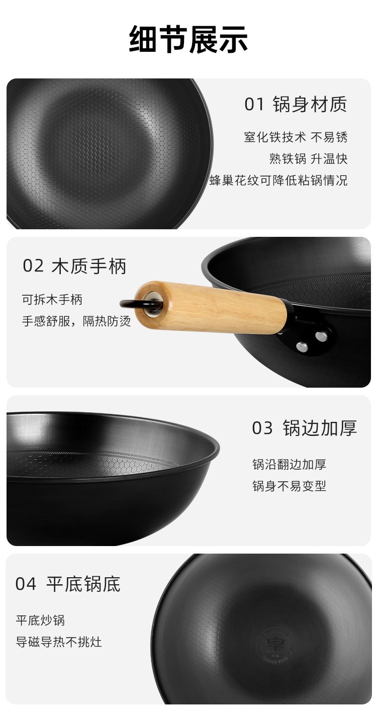 1、精铁锅\不挑灶\升温快黑金蜂巢炒锅铁铲任意炒,蜂巢纹路|健康0涂层|不挑食材。