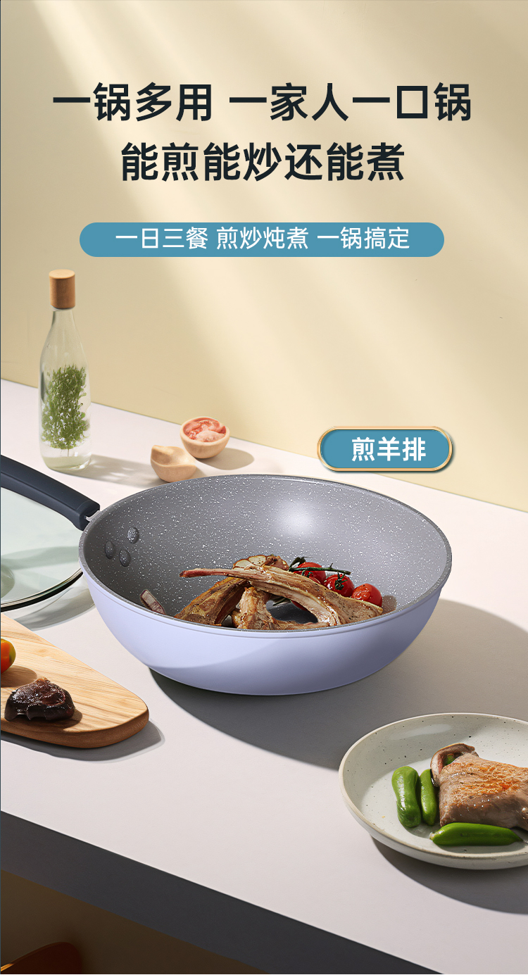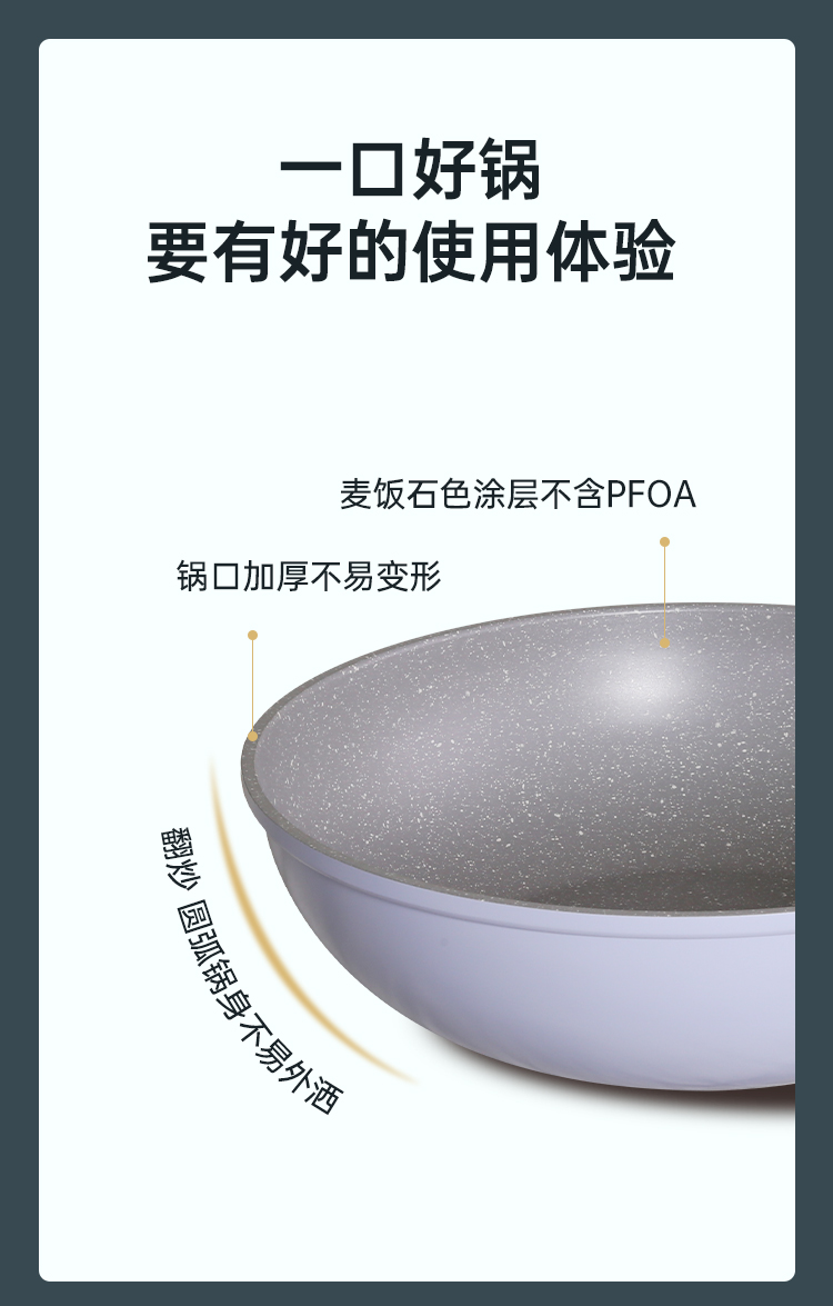 2、麦饭石色涂层不含PFOA,锅口加厚不易变形,圆弧锅身不易外洒。