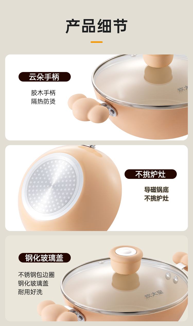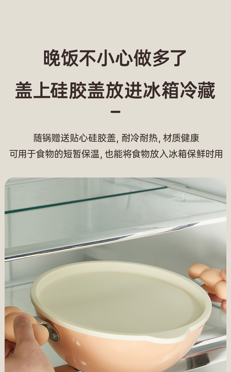 3、随锅赠送贴心硅胶盖,耐冷耐热,材质健康,复合锅底,换灶不换锅,锅小用途大