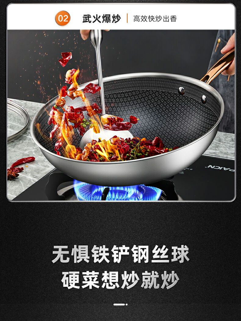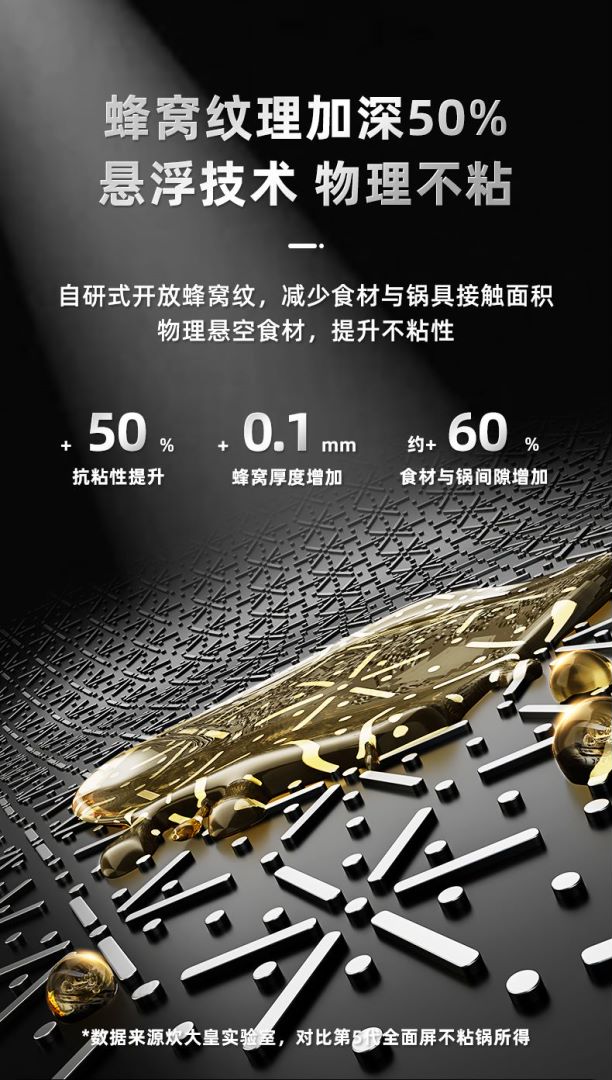1、加深蜂窝纹防粘实力派,锅内蜂窝全新纹理开放性,全射频浮刻技术,油路通畅更省油。
