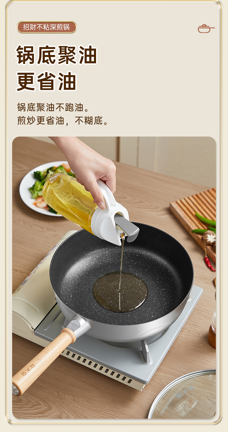 1、轻油不粘一锅多用加深锅高,锅底聚油不跑油煎炒更省油,不糊底。