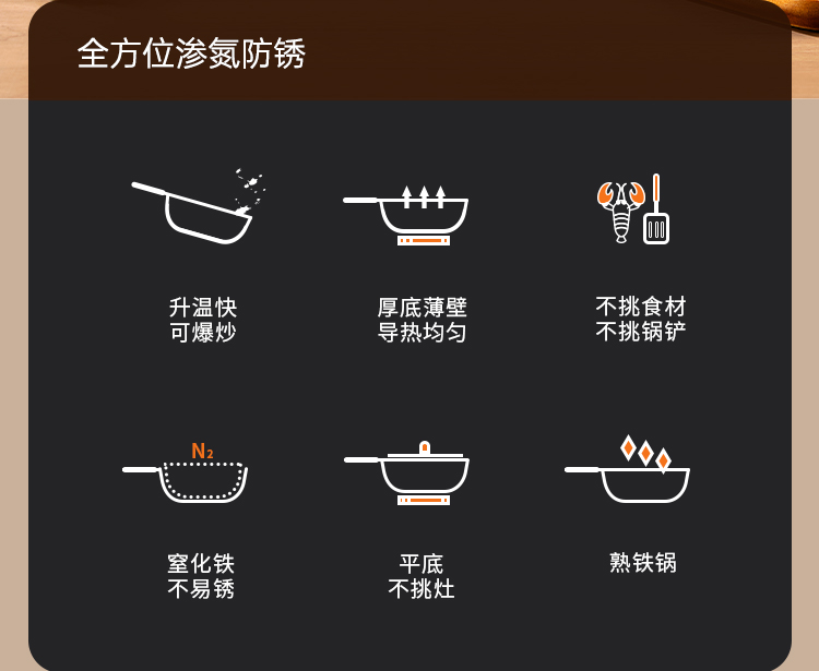 1、严选精铁真正的0涂层铁焱炒锅,疏油纹路,轻便好掂。