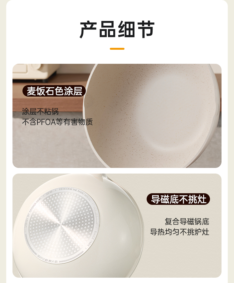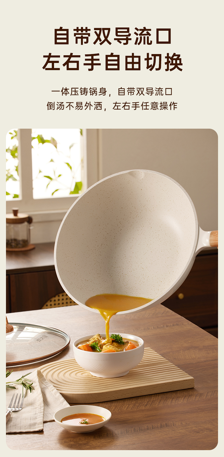 2、自带双导流口左右手自由切换一体压铸锅身,自带双导流口倒汤不易外洒,左右手任意操作