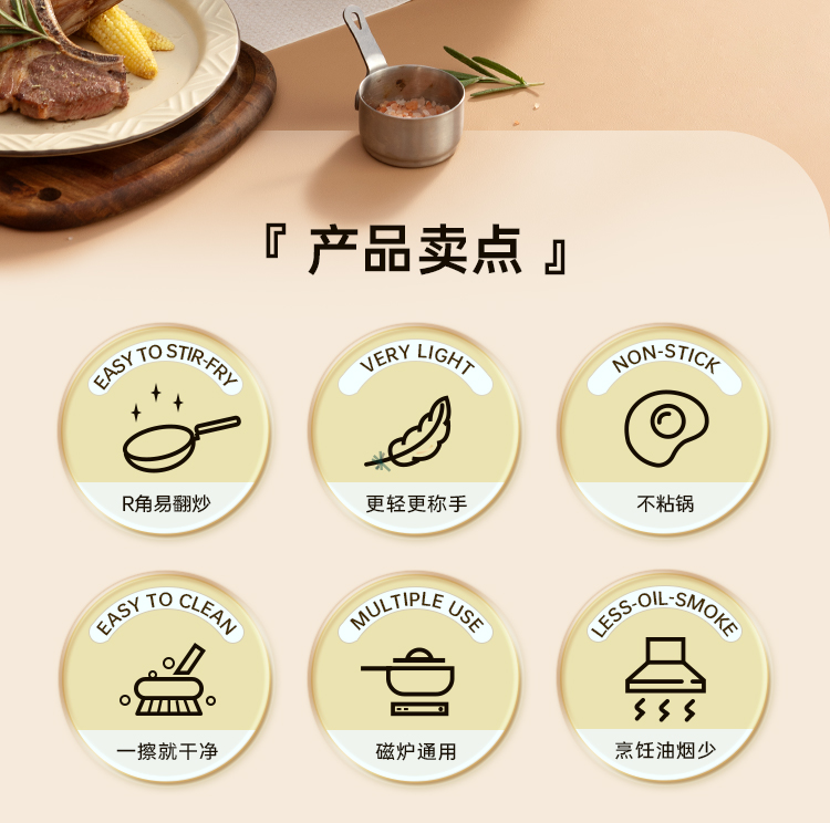 1、锅身升级R角弧度翻炒更丝滑不易洒,锅胚多次打磨锅身减轻至约970g,厚底薄壁,匀热控油,少油烹饪美食轻油美食爱好者的福音。