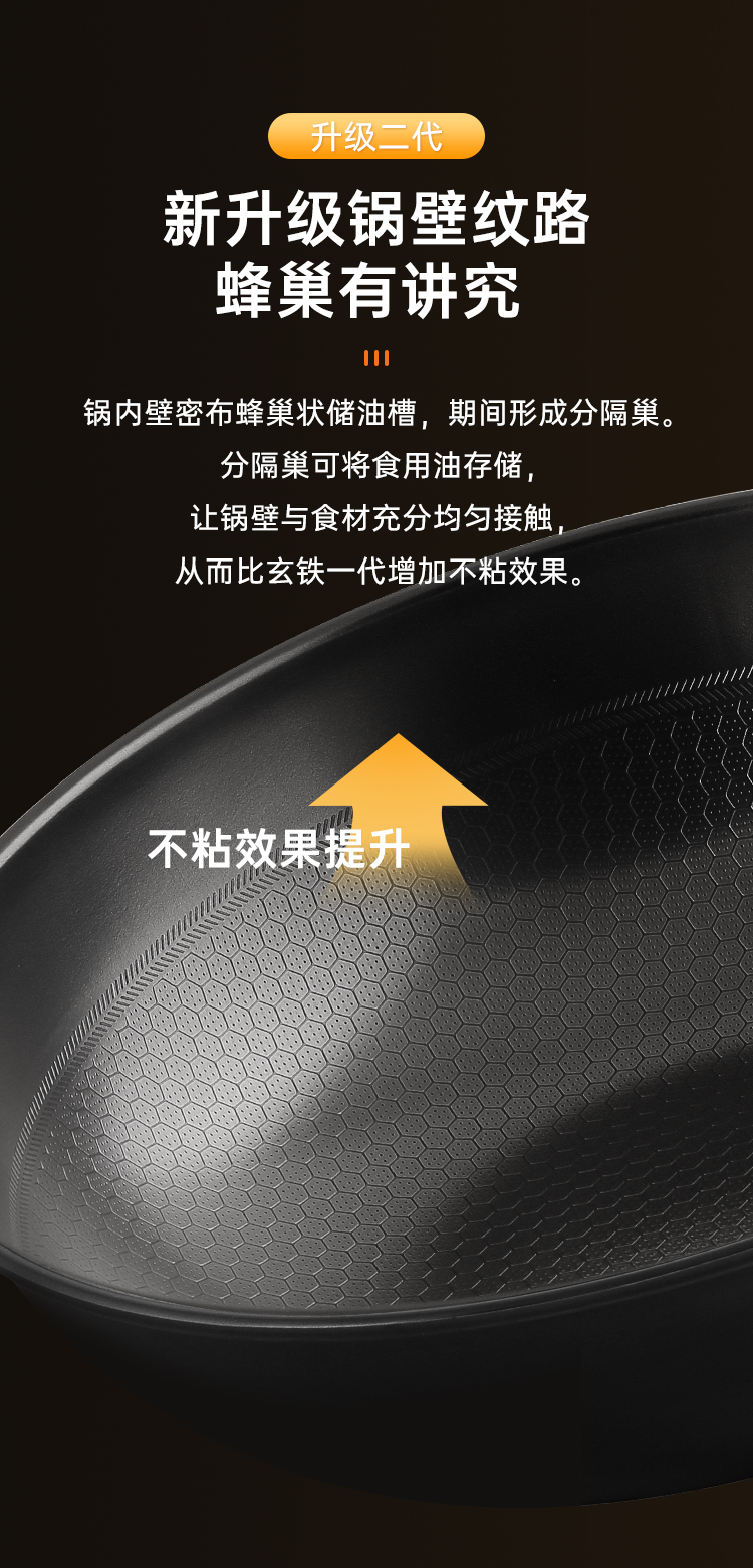 2、锅内壁密布蜂巢状储油槽,期间形成分隔巢。分隔巢可将食用油存储,让锅壁与食材充分均匀接触,从而比玄铁一代增加不粘效果。