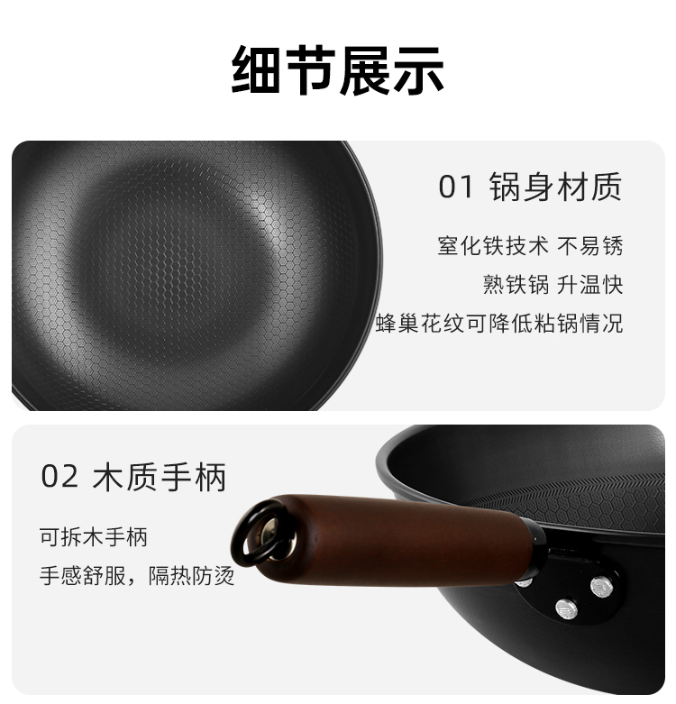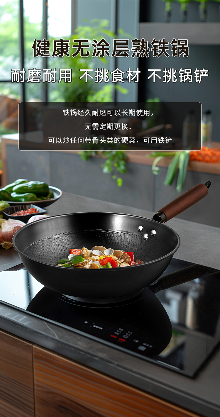 1、玄铁精铁锅铁铲任意炒,蜂巢纹路健康0涂层。