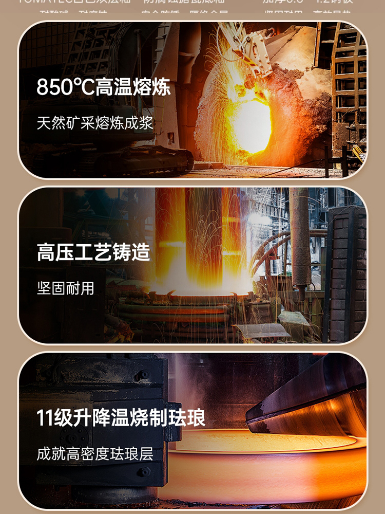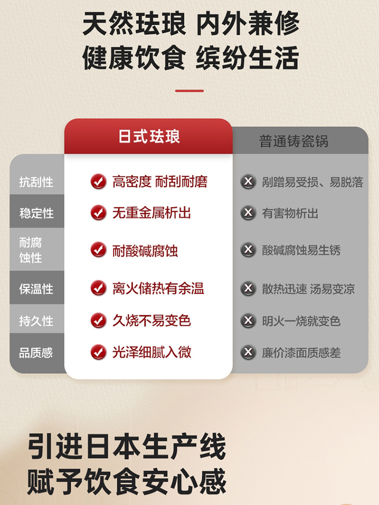 1、采用日本进口材料,珐琅工艺,返璞归真,经久耐用,抗酸碱防腐蚀,安心烹饪每一餐。