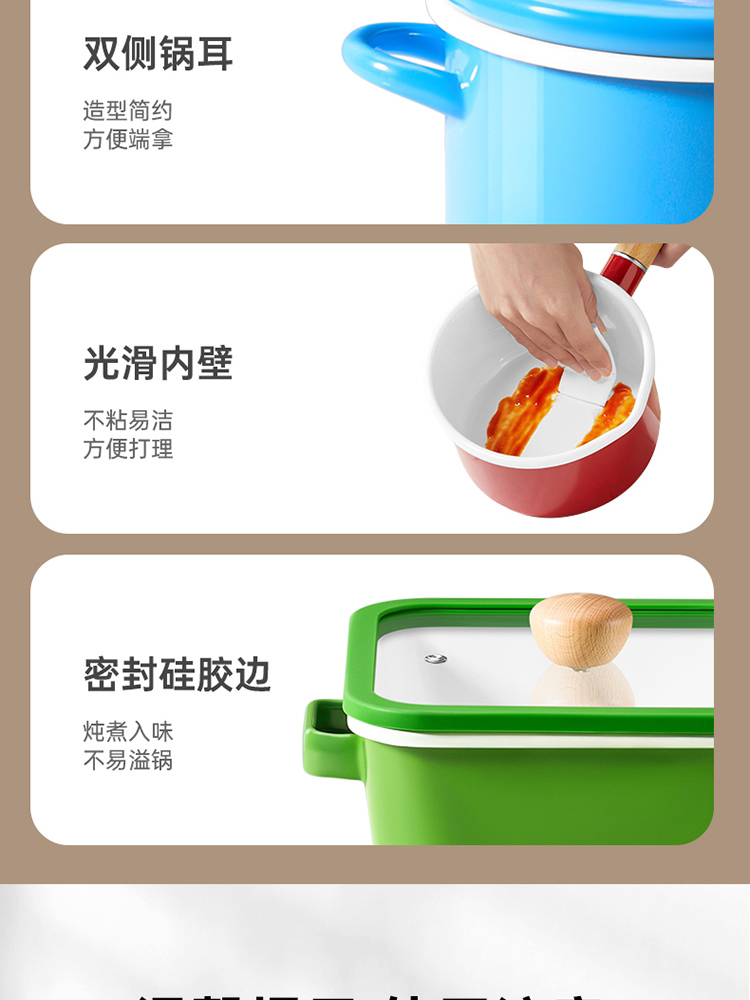 3、多种炉灶均可使用,大小厨房烹饪游刃有余,锅身内外均为搪瓷材质,内刷不伤锅,外刷不掉色,清洗安心无忧。