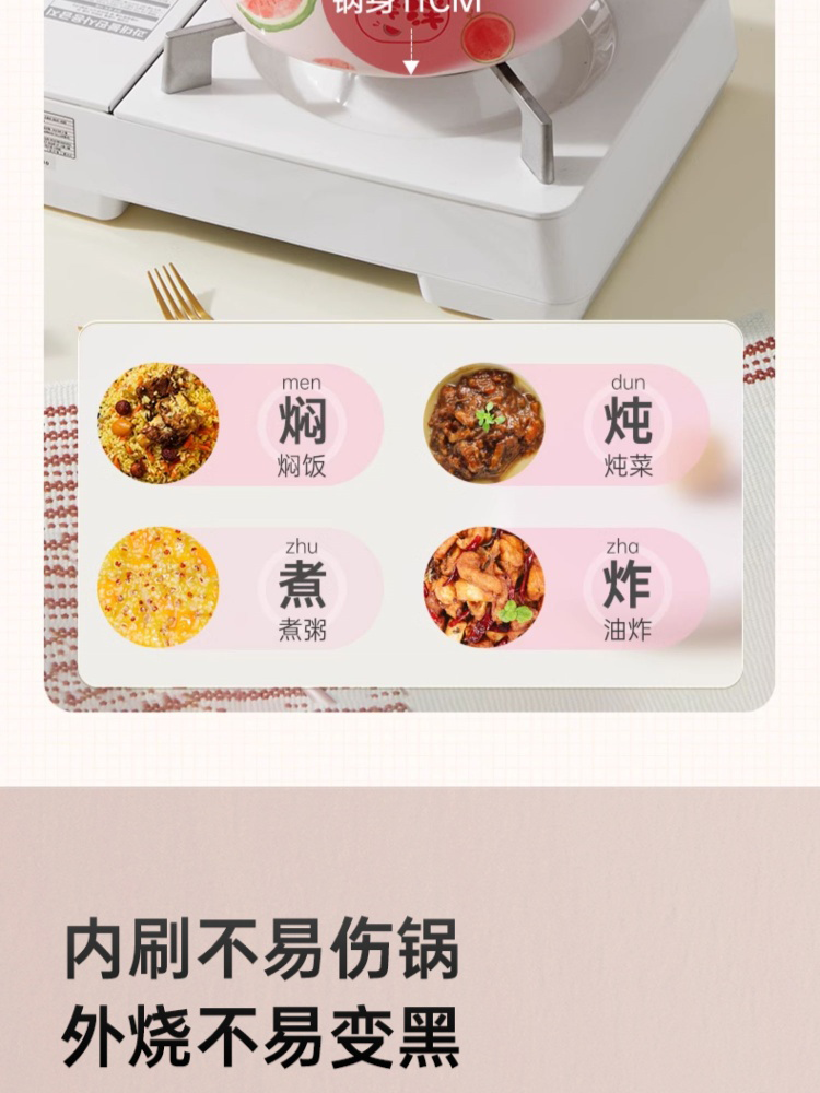 3、内刷不伤锅,外烧不变黑,美锅不娇气,炉灶通用不惧明火、烹饪无小事、细节见匠心。