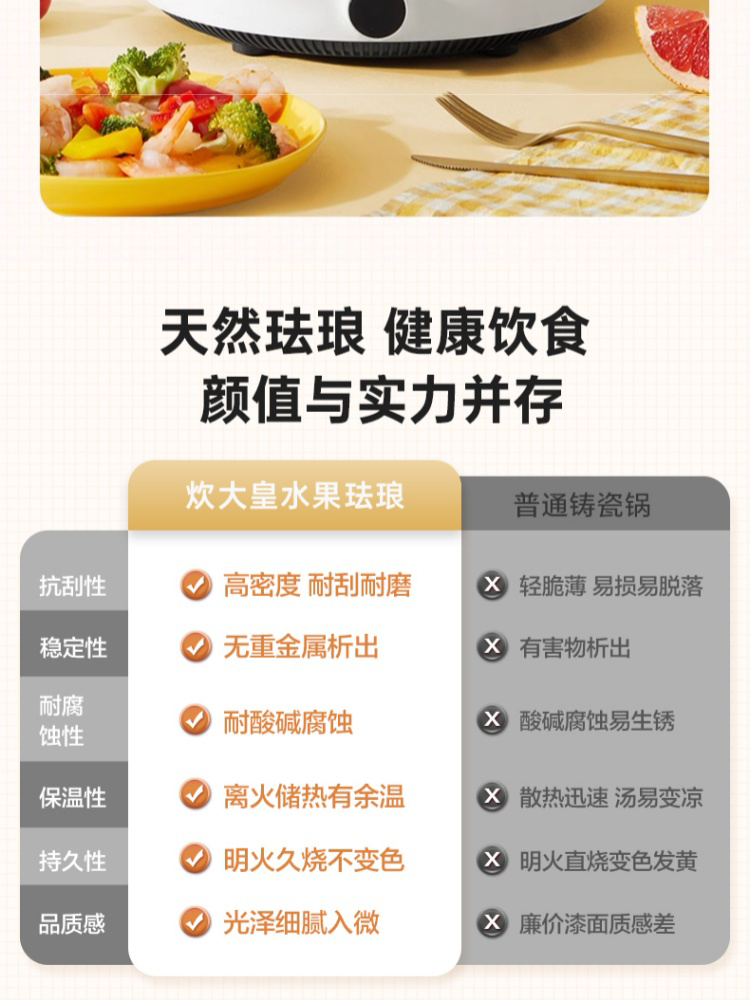 3、内刷不伤锅,外烧不变黑,美锅不娇气,炉灶通用不惧明火、烹饪无小事、细节见匠心。