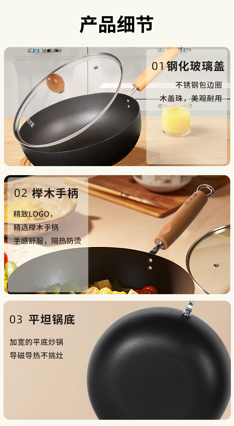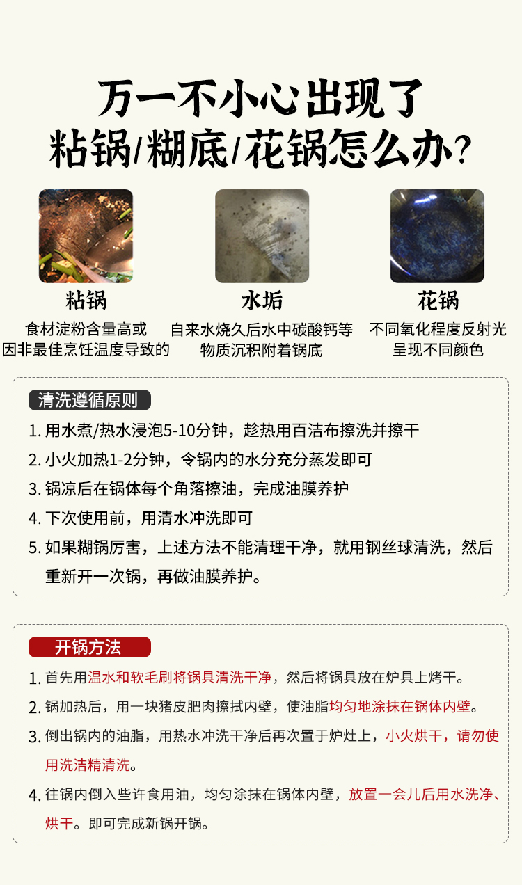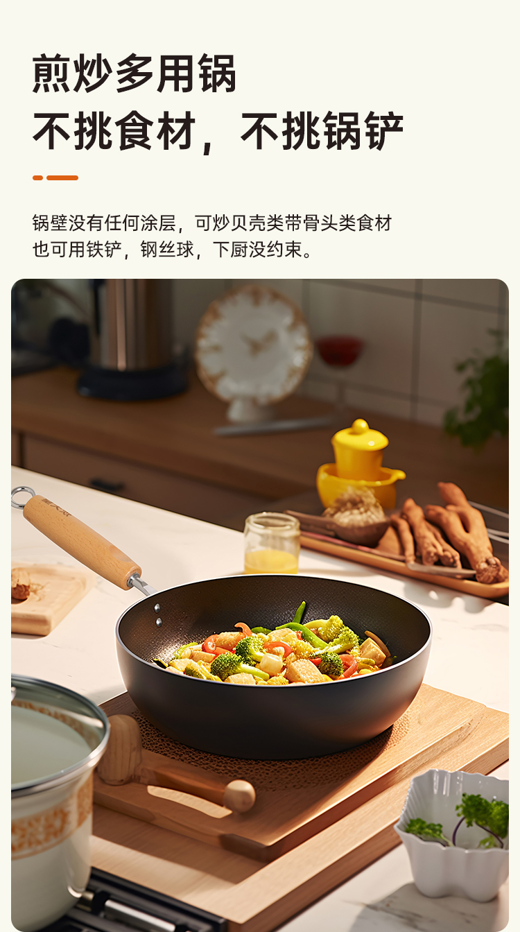 1、煎炒多用锅,不挑食材,不挑锅铲锅壁没有任何涂层,可炒贝壳类带骨头类食材也可用铁铲,钢丝球,下厨没约束。