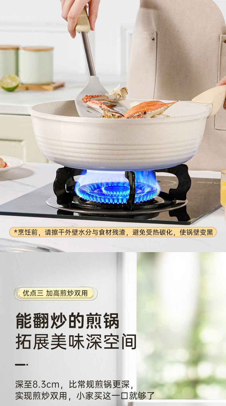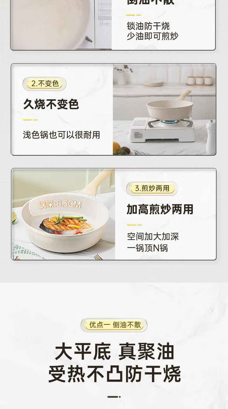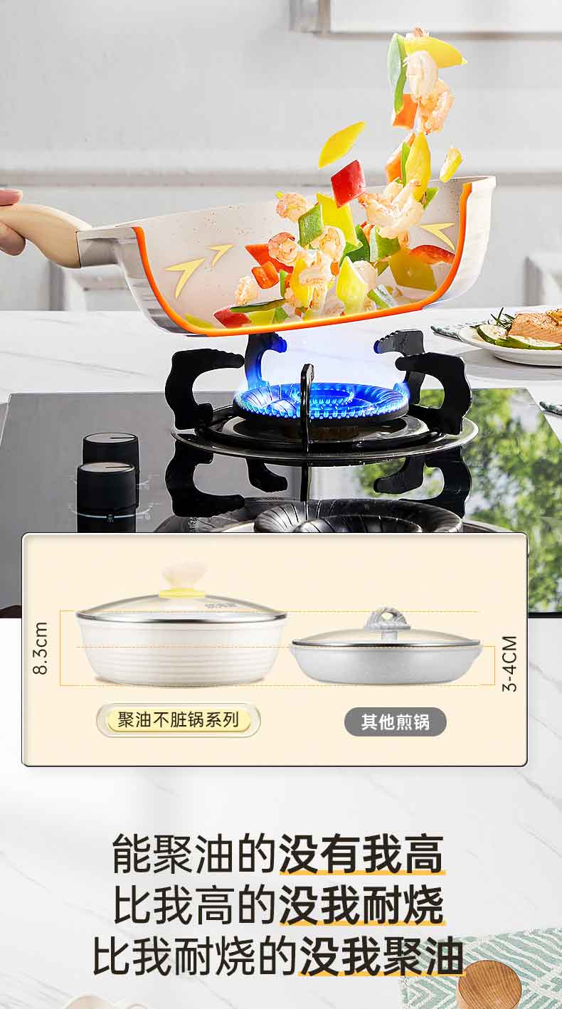 3.优点一 倒油不散,大平底 真聚油,受热不凸防干烧,将油锁在锅中心,锅底浸油防干烧,食材匀油煎炒,不易焦糊。