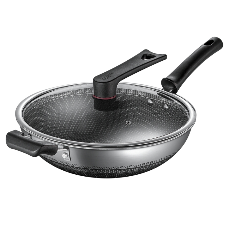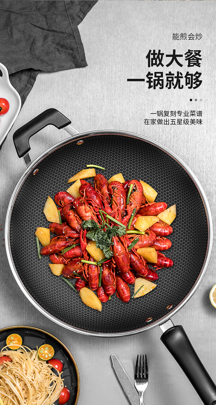 1、美食色香味俱佳锅底浪花纹设计,传热效率提高30%导热二次提升,高温爆炒出锅气