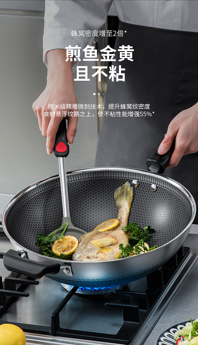 3、内不粘锅 外节能聚火锅内全面屏蜂窝纹,物理不粘