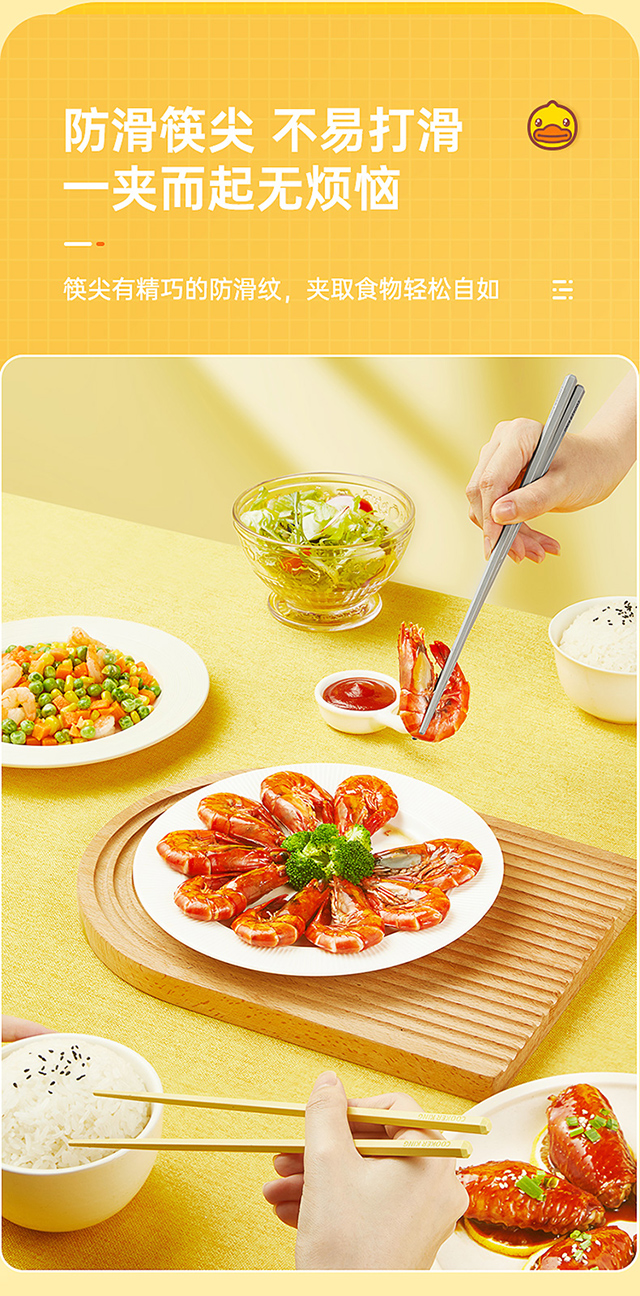 2、食品接触级材质,耐高温不掉色,手感舒适的方形筷身设计,放在桌上更稳定,筷尖有精巧的防滑纹,夹取食物轻松自如。