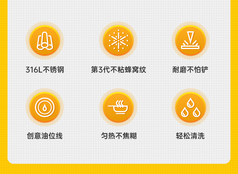 2.打破粘锅的魔咒变身厨艺达人,3.0版蜂窝纹加持,悬浮物理抗粘,下厨如此轻松。