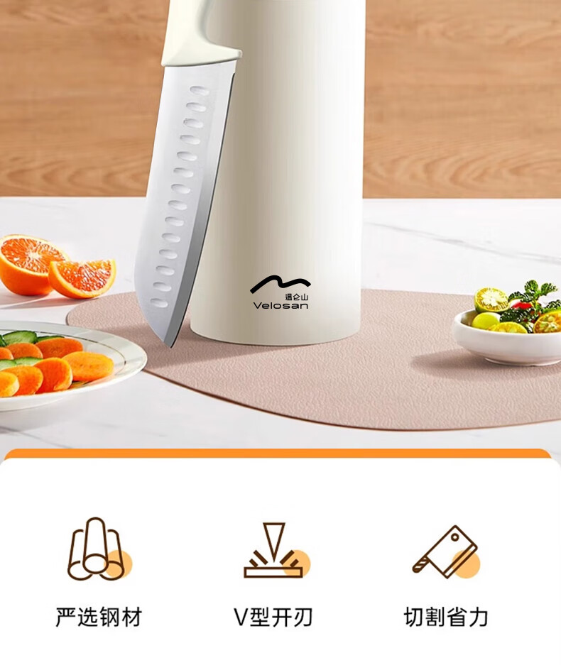 【材质】不锈钢+PP 【规格】 切片刀、厨师刀、水果刀、剪刀、收纳底座