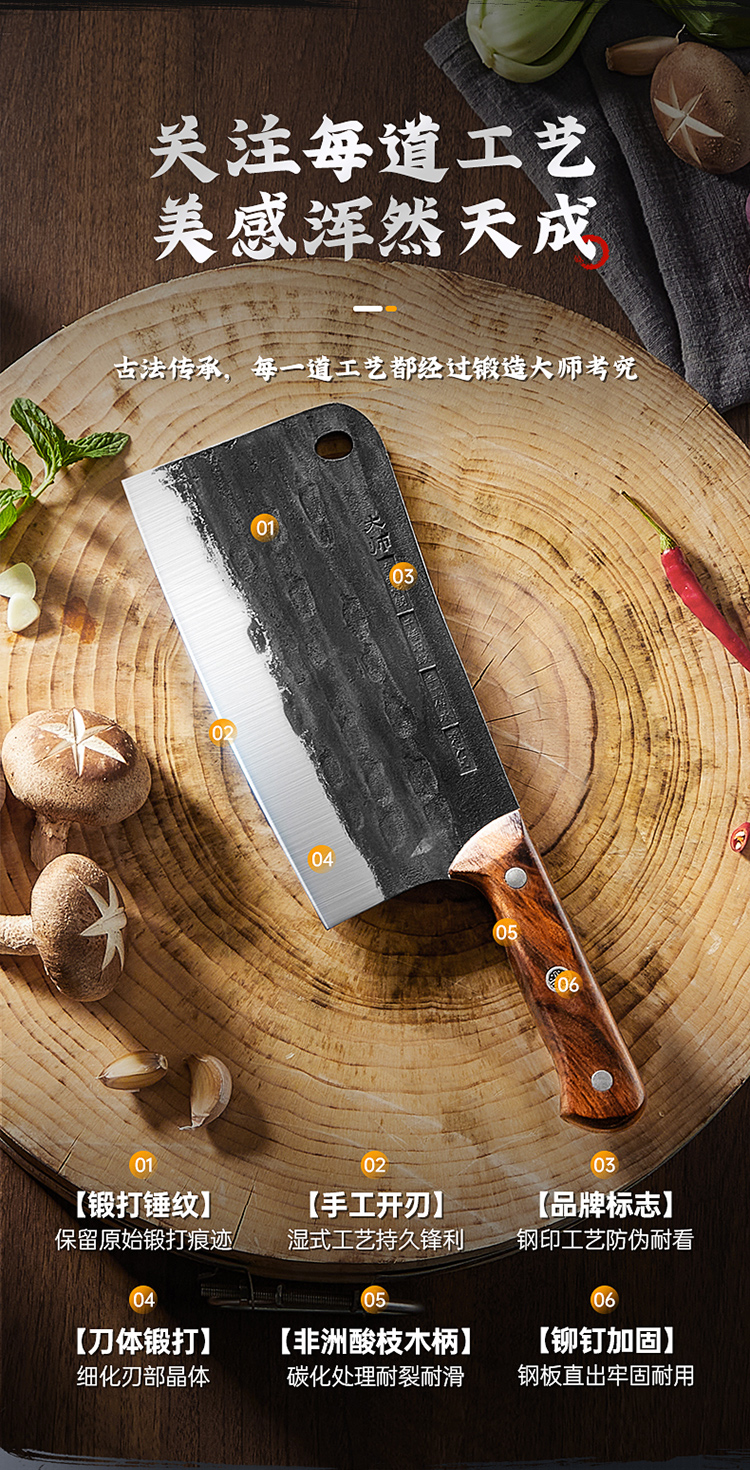 3、锻打锤纹表面,减少与食材接触阻力食材不易粘连,切配更利落,三颗铆钉强力固定,耐用不易脱柄甄选非洲酸枝,握感圆润舒适。