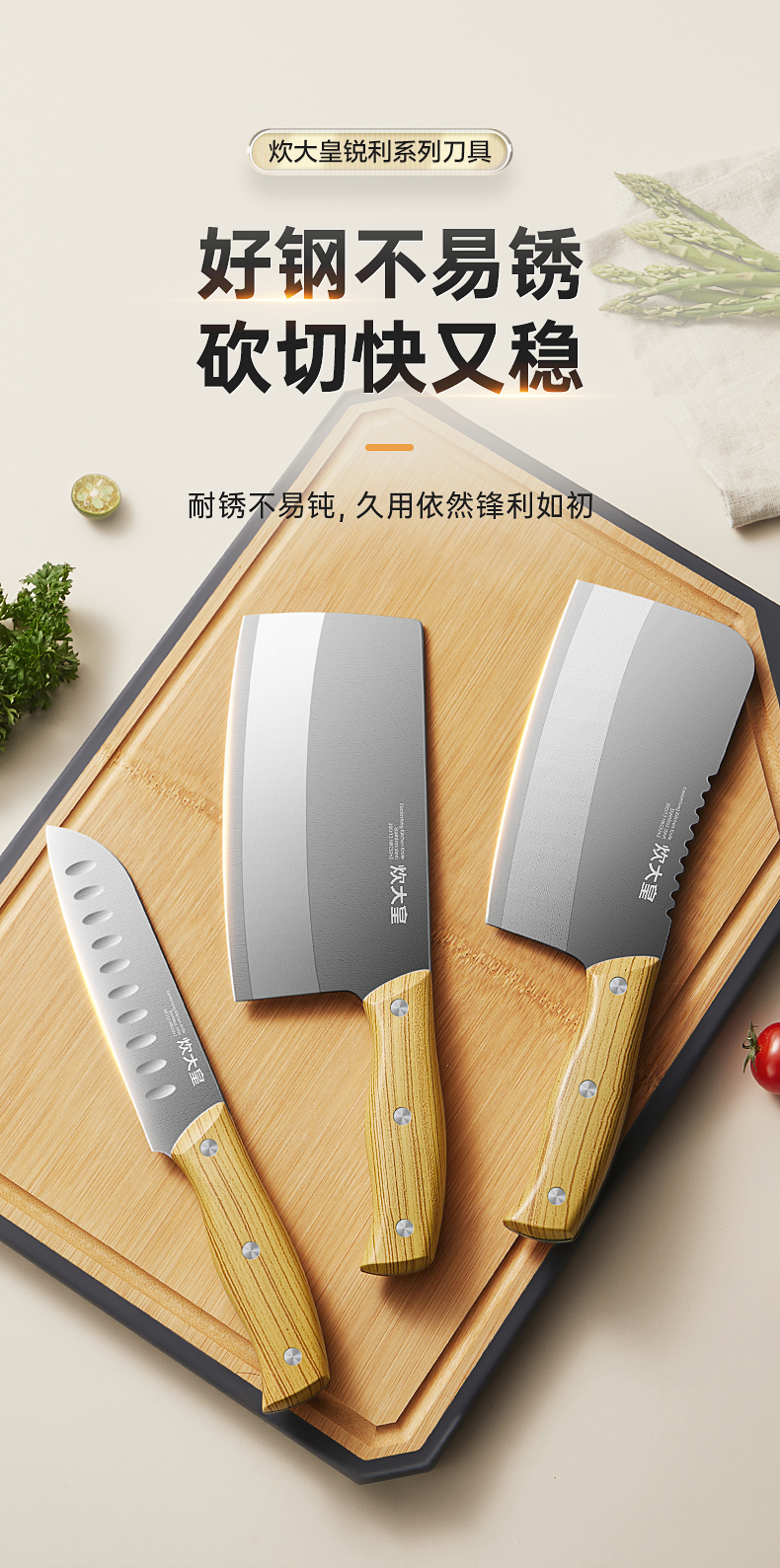 2、精湛工艺打磨,提升刀刃锋利度手起刀落,瞬间片开食材,紧锁食材汁水。