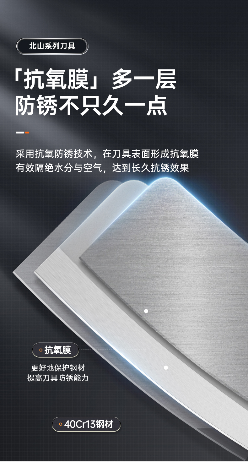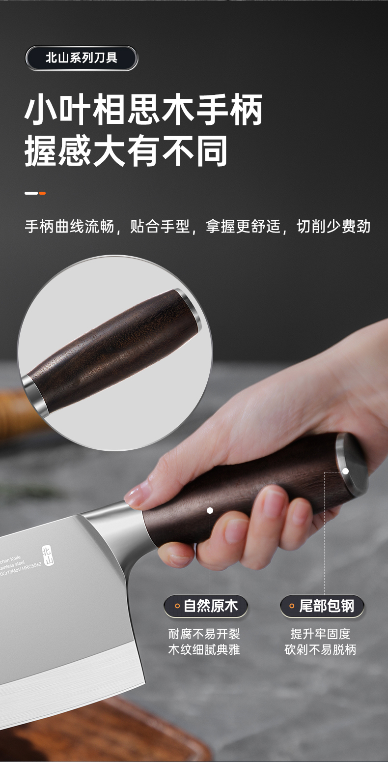 3、锋利不易钝源于40Cr13好钢材,手工湿式水磨开刃,刃口锋利升级让切配比你想象的更畅快。