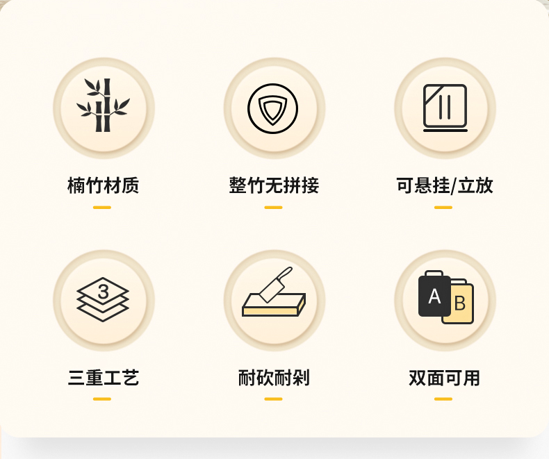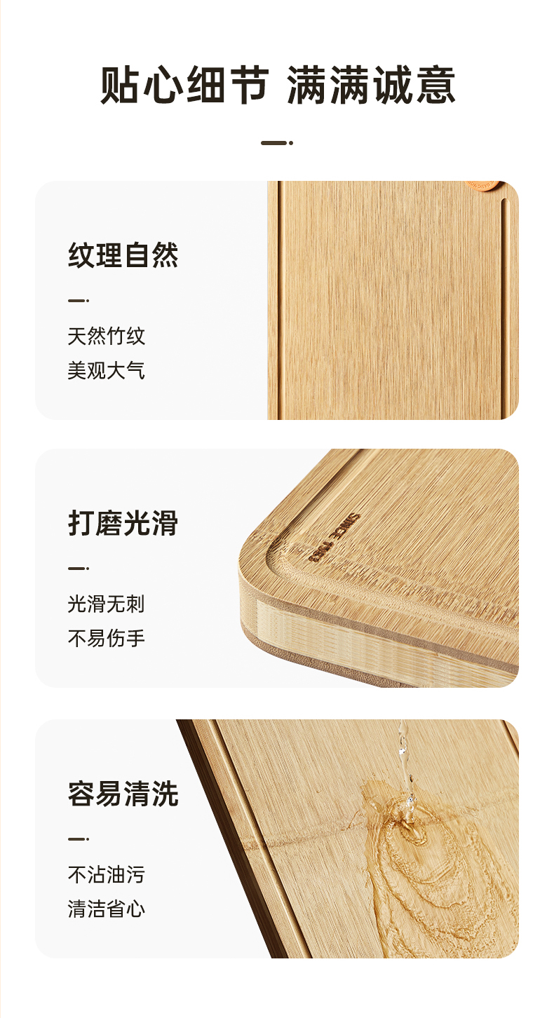 2、甄选上等原生态成年高山楠竹质地细密,不易吸水厚实耐用,板身加厚设计,扎实不易裂,轻松应对砍剁。