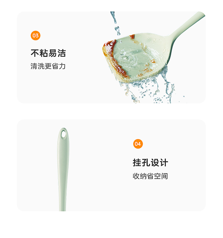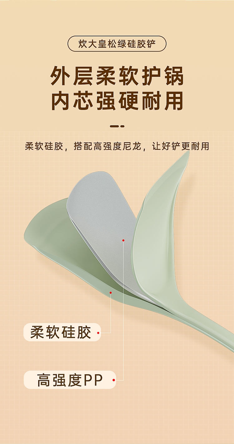 4、外层柔软护锅内芯强硬耐用柔软硅胶,搭配高强度尼龙,让好铲更耐用