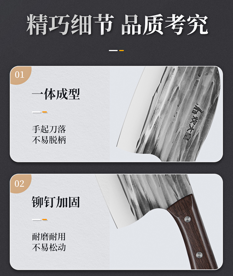 1、古法手工锻打、质地均匀耐磨损、刀刀利落不粘连、历久弥新 坚韧锋利,利刃快刀、切配快速不停顿,轻松掌握厨房切配技巧。