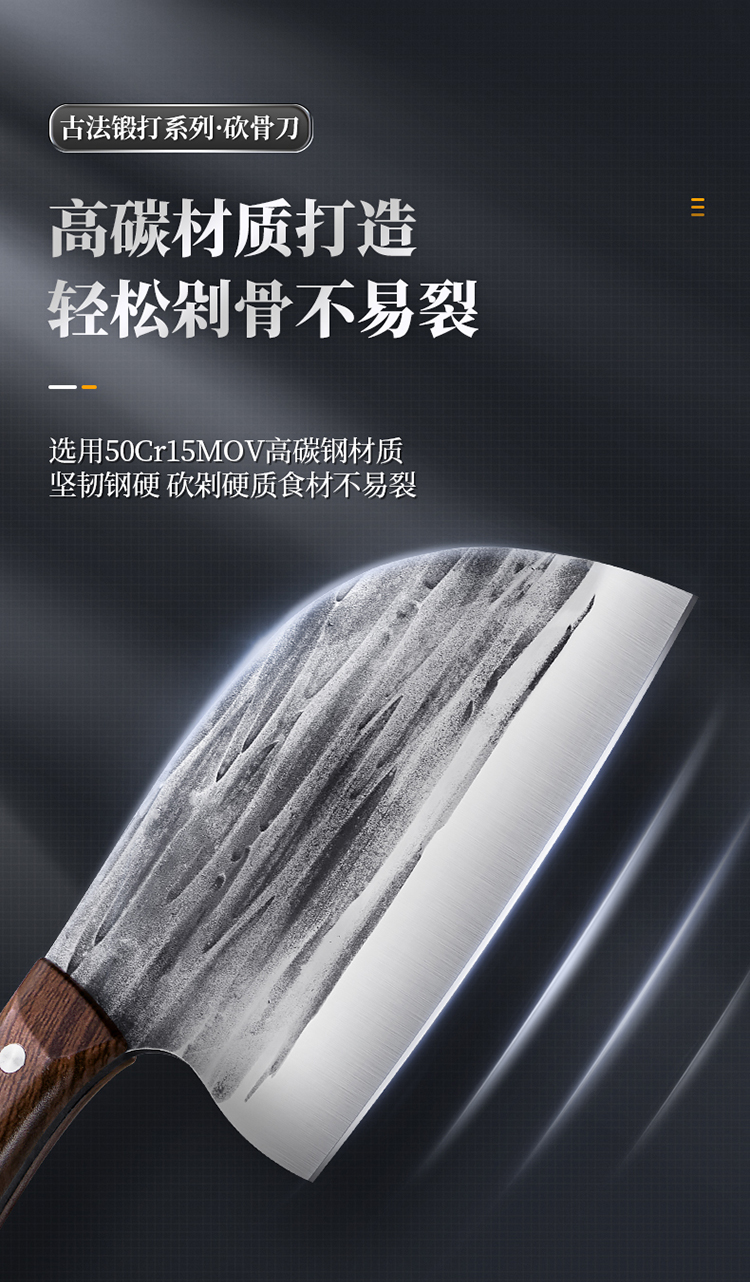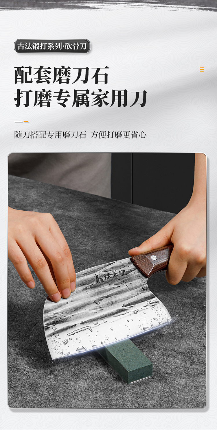 1、古法手工锻打、质地均匀耐磨损、刀刀利落不粘连、历久弥新 坚韧锋利,利刃快刀、切配快速不停顿,轻松掌握厨房切配技巧。