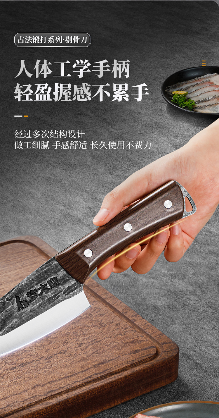 1、古法手工锻打、质地均匀耐磨损、刀刀利落不粘连、历久弥新 坚韧锋利,利刃快刀、切配快速不停顿,轻松掌握厨房切配技巧。