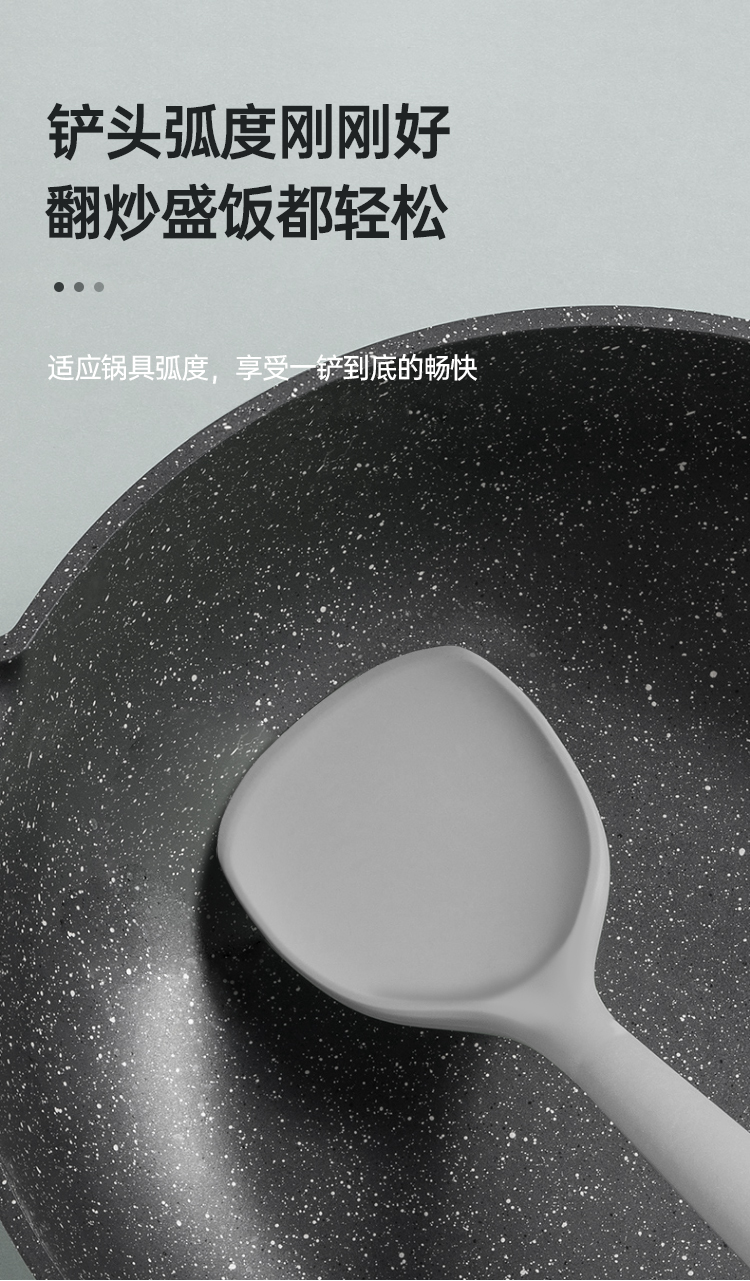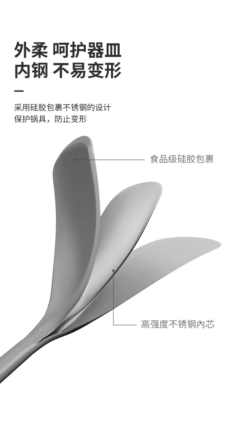 2、铲头弧度刚刚好,翻炒盛饭都轻松,适应锅具弧度,享受一铲到底的畅快,采用硅胶包裹不锈钢的设计,保护锅具,防止变形。