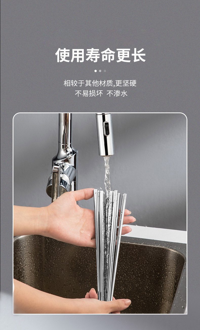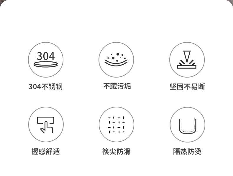 2、无缝筷身不藏污纳垢易于清洗,光亮如镜精美外观彰显品质,凹凸防滑纹理稳稳夹住食材不滑落