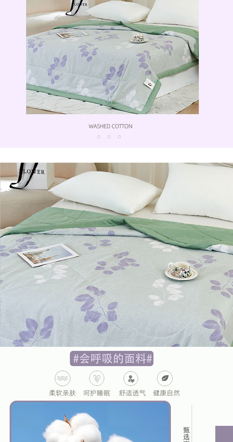 臻选大自然的全棉材质,100%全棉面料,吸湿透气,柔软亲肤,如同被云朵包裹,给您不一样的舒适睡眠;活性印染,久洗不掉色