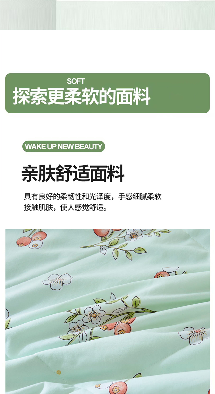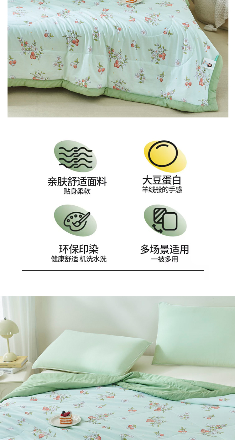 天然环保,亲肤透气:精选大豆蛋白纤维,源自植物萃取,触感如丝绸般柔滑细腻,透气性优于传统棉被,吸湿排汗性能卓越,炎夏不闷汗,空调房不黏腻,敏感肌也能安心使用。
