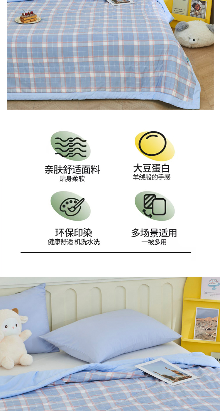 天然环保,亲肤透气:精选大豆蛋白纤维,源自植物萃取,触感如丝绸般柔滑细腻,透气性优于传统棉被,吸湿排汗性能卓越,炎夏不闷汗,空调房不黏腻,敏感肌也能安心使用。