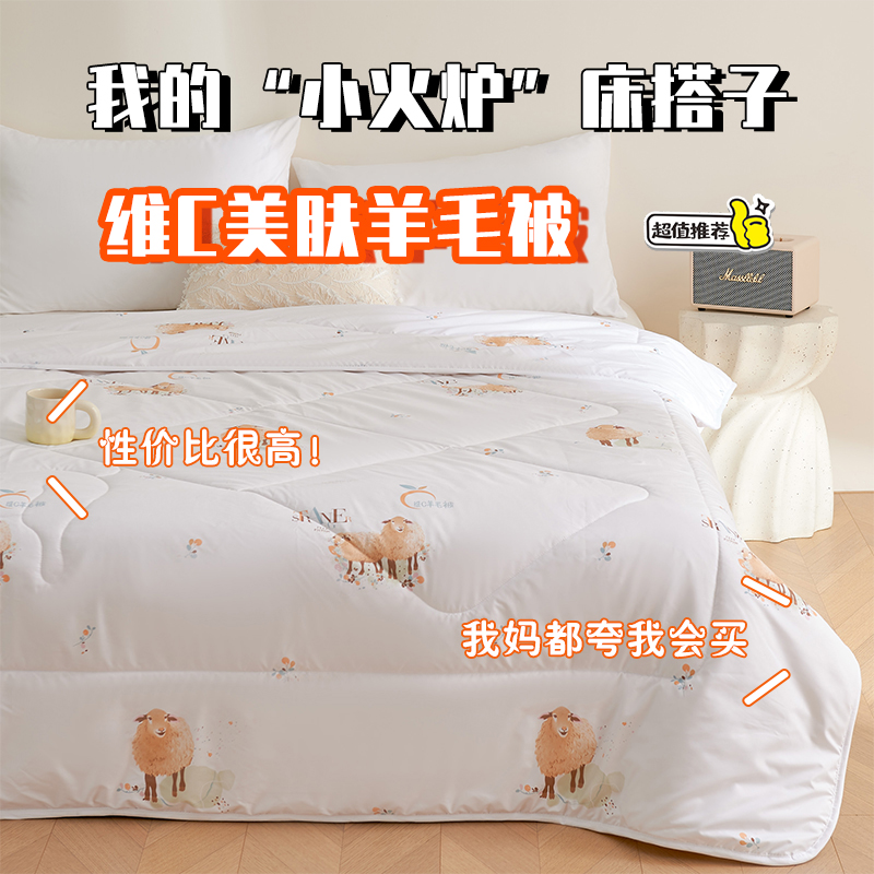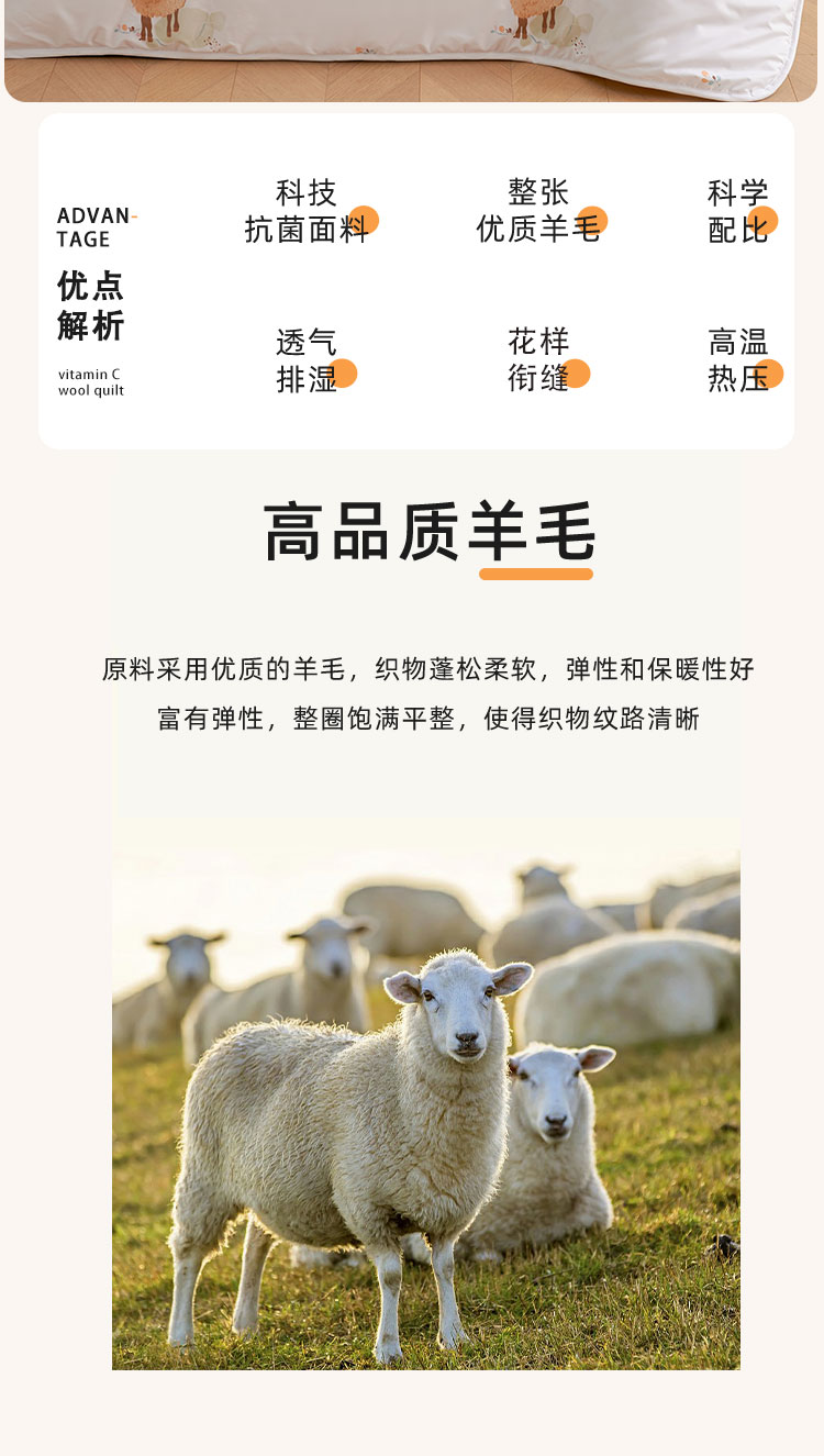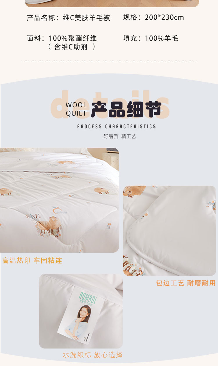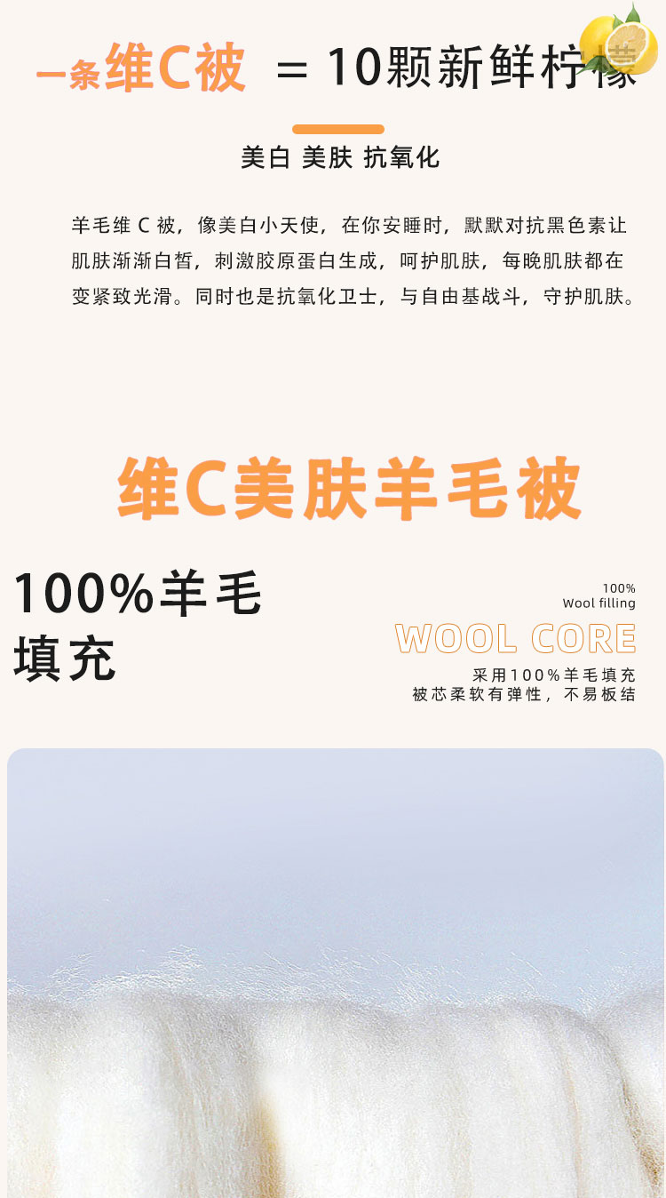 100%羊毛填充,羊毛具有极佳的吸、放湿性,能不断吸收自人体散发的湿气与汗液,并将之排放到空气中,以使被褥保持干爽,舒适。添加了维 C成分的羊毛被,像美白小天使,在你安睡时,默默对抗黑色素让肌肤渐渐白皙,刺激胶原蛋白生成,呵护肌肤,每晚肌肤都在变紧致光滑,同时也是抗氧化卫士,与自由基战斗,守护肌肤。
