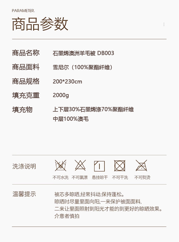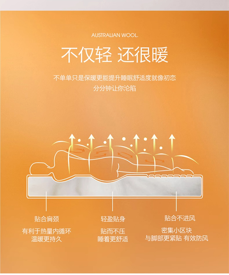 " 石墨烯红外智能发热,3分钟快速升温,整夜恒温呵护;自适应调温系统,体感温差近乎无感,睡眠更舒适;澳洲美利奴羊毛臻选超细羊毛,蓬松柔暖,媲美云端触感,天然防螨抗菌,守护敏感肌,安心整夜好眠;静音抗静电设计,翻身无扰,晨起依旧优雅;可追溯生态澳洲羊毛,环保科技,品质始终如一;追求极致温暖的冬日,对睡眠品质有苛求的您,高端家居或馈赠之首选。